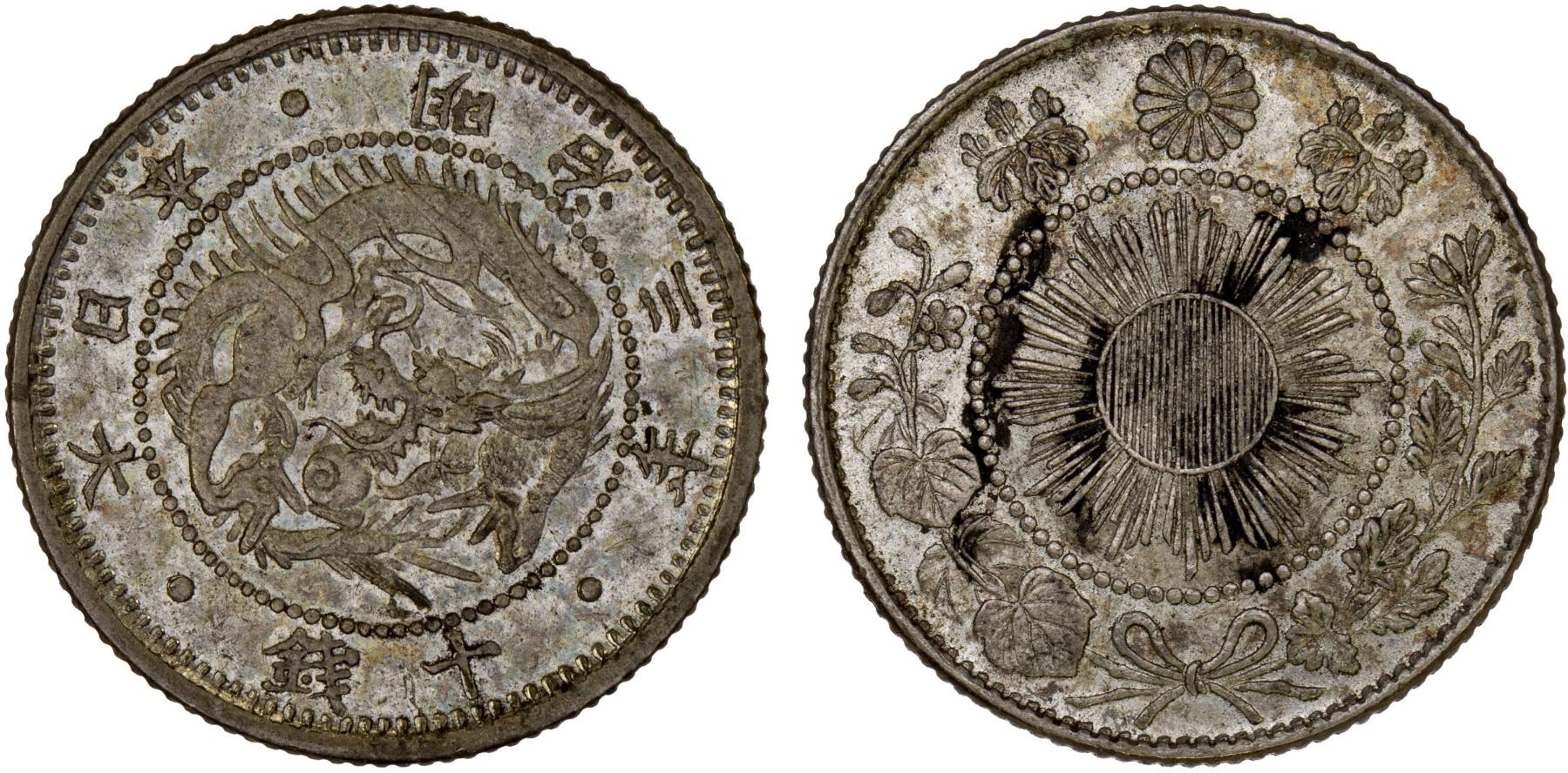 JAPAN: Meiji, 1868-1912, AR 10 sen, year 3 (1870), Y-2, JNDA-01-23, shallow scales variety, with ink chop on reverse, Unc.