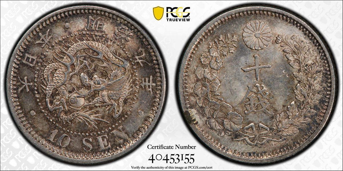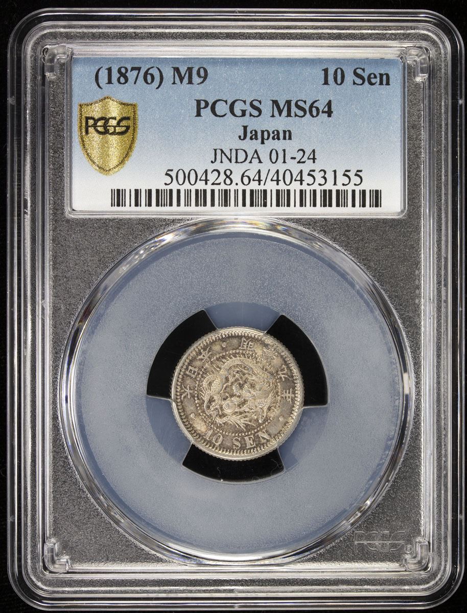 JAPAN: Meiji, 1868-1912, AR 10 sen, year 9 (1876), Y-23, JNDA-01-24, PCGS graded MS64.