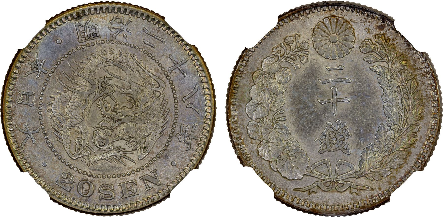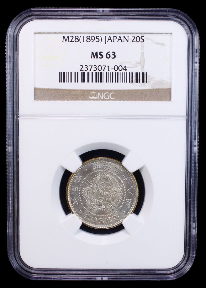 JAPAN: Meiji, 1868-1912, AR 20 sen, Year 28 (1895), Y-24, a lovely example, NGC graded MS63.