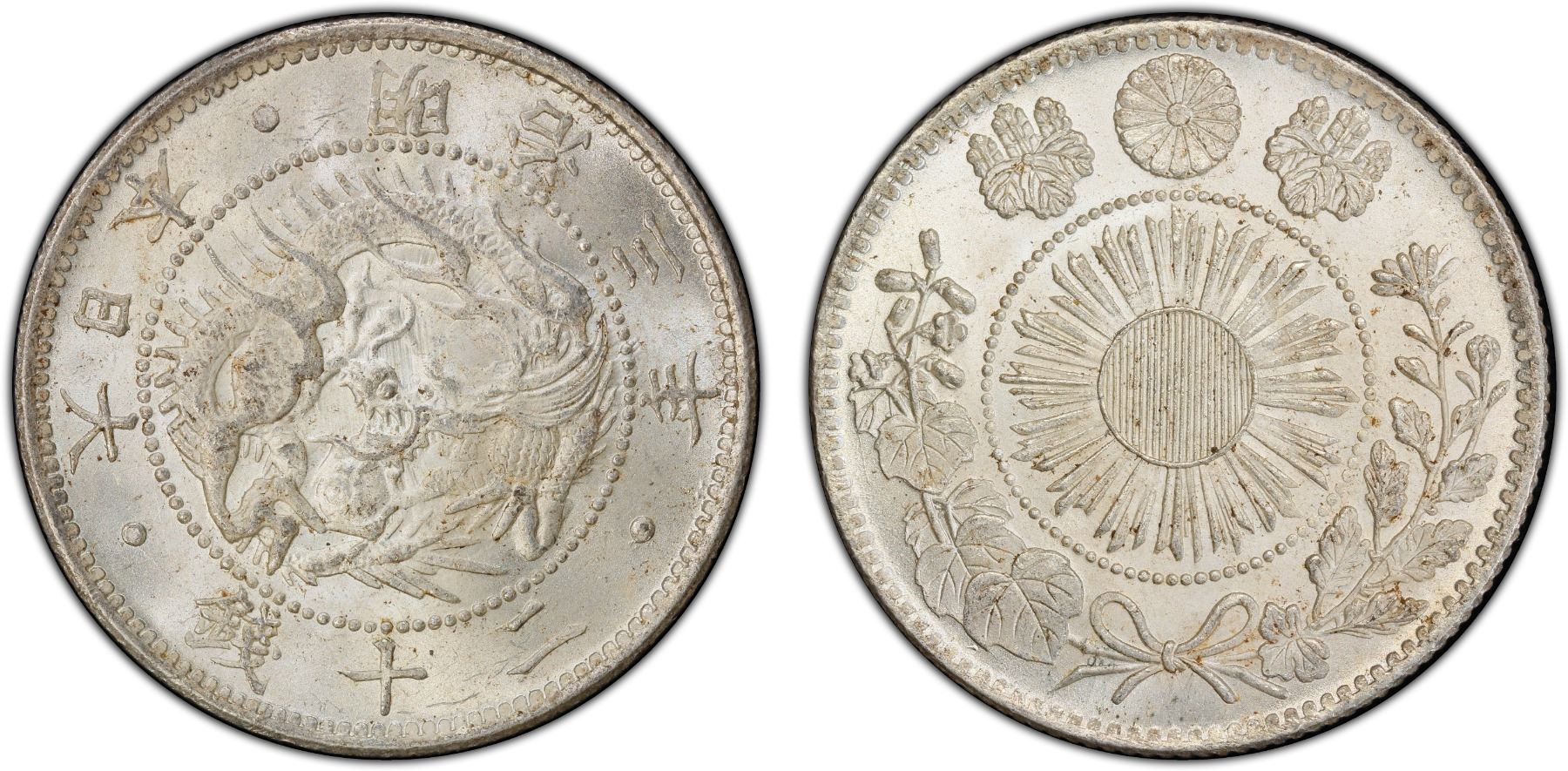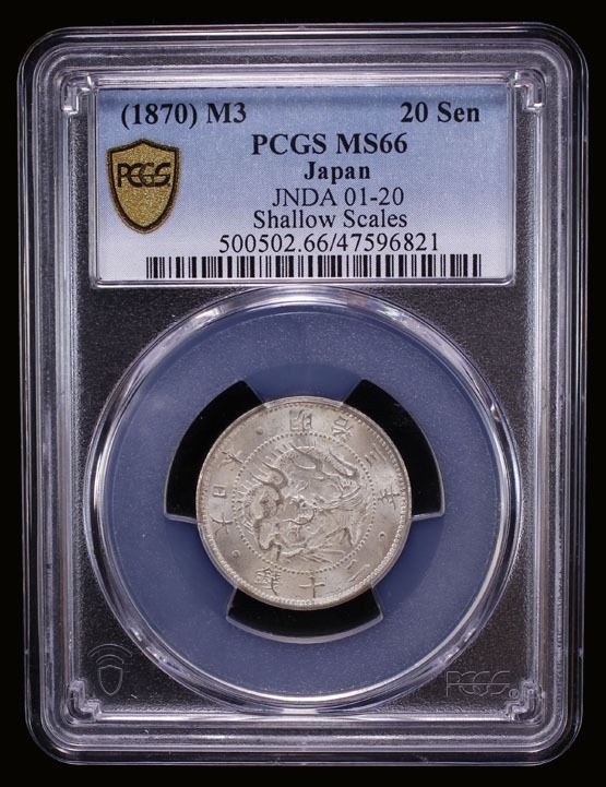 JAPAN: Meiji, 1868-1912, AR 20 sen, year 3 (1870), PCGS MS66