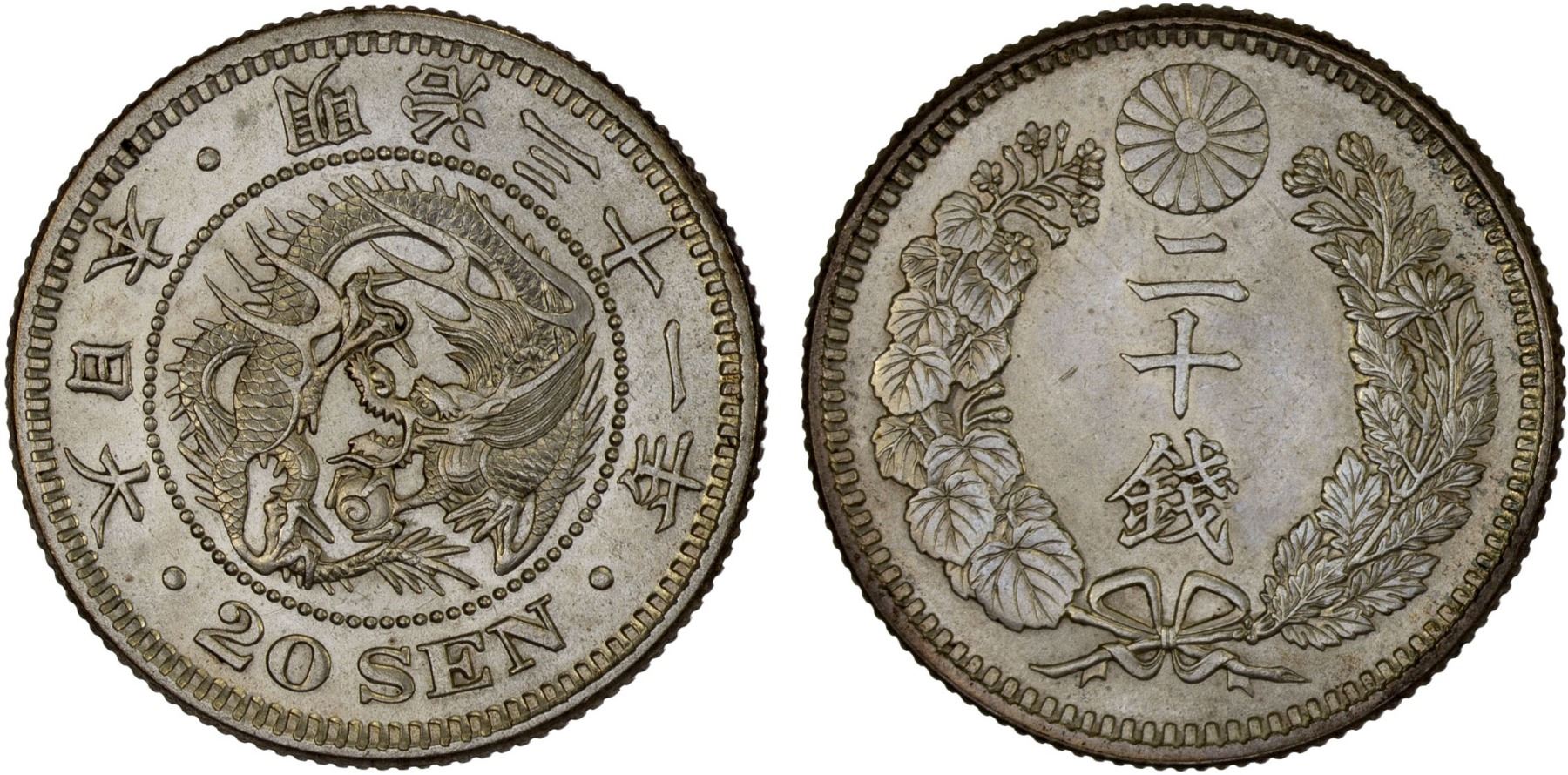 JAPAN: Meiji, 1868-1912, AR 20 sen, year 31 (1898), Y-24, attractive and lustrous, Unc.