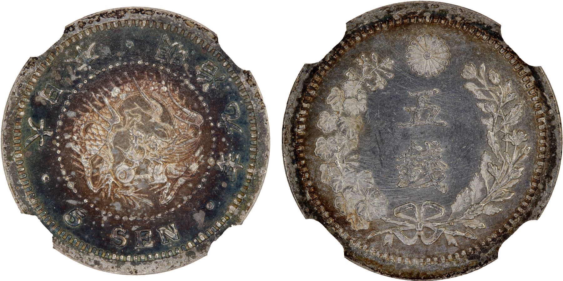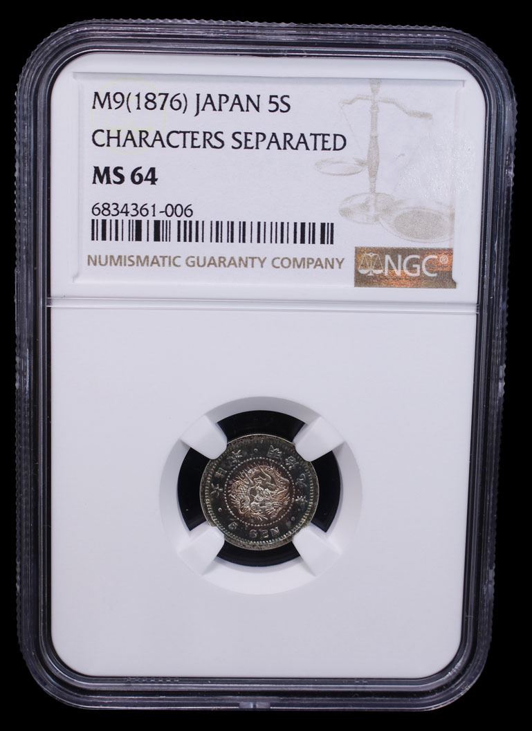 JAPAN: Meiji, 1868-1912, AR 5 sen, year 9 (1876), Y-22, JNDA-01-35, type 2; character separated variety, NGC graded MS64.