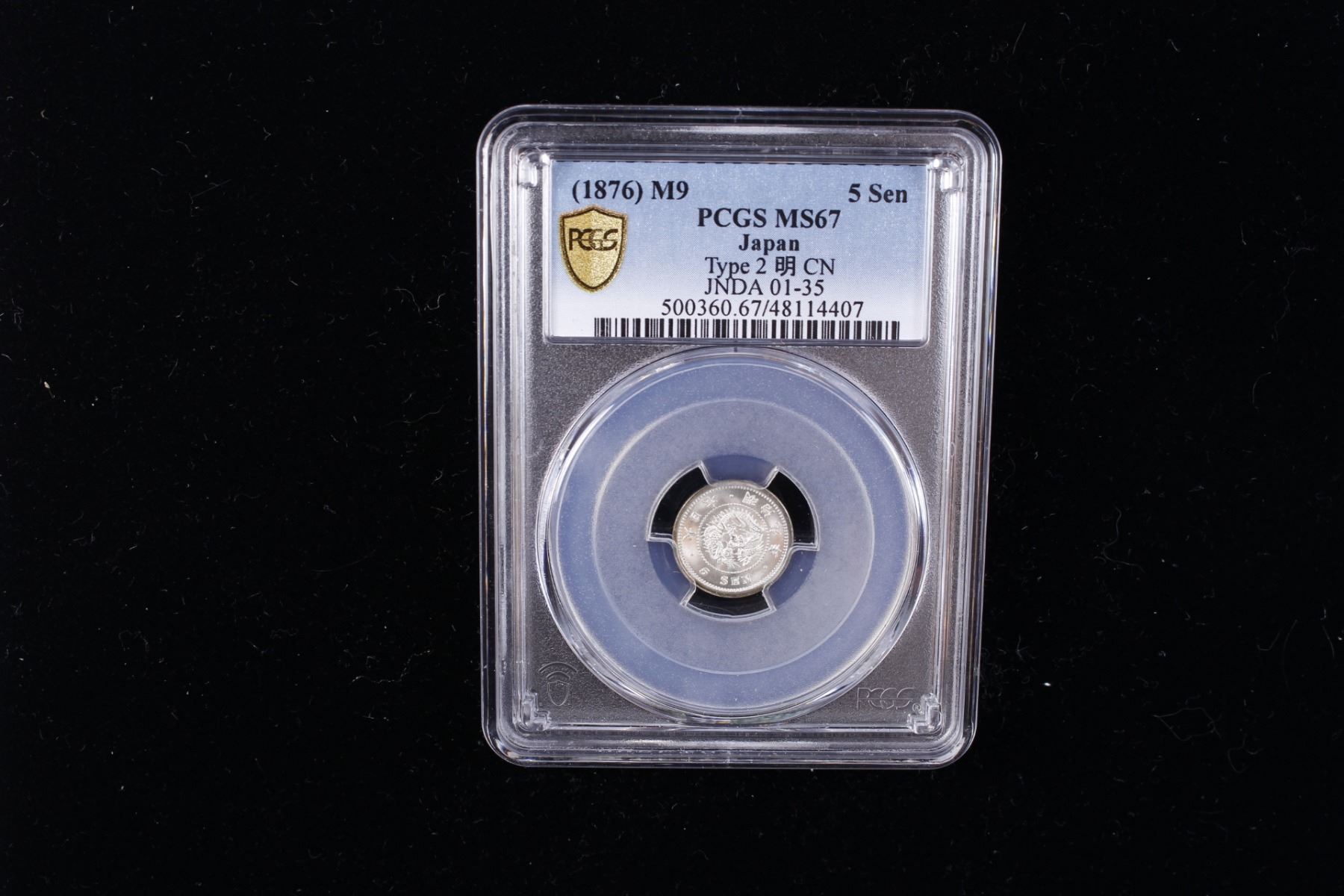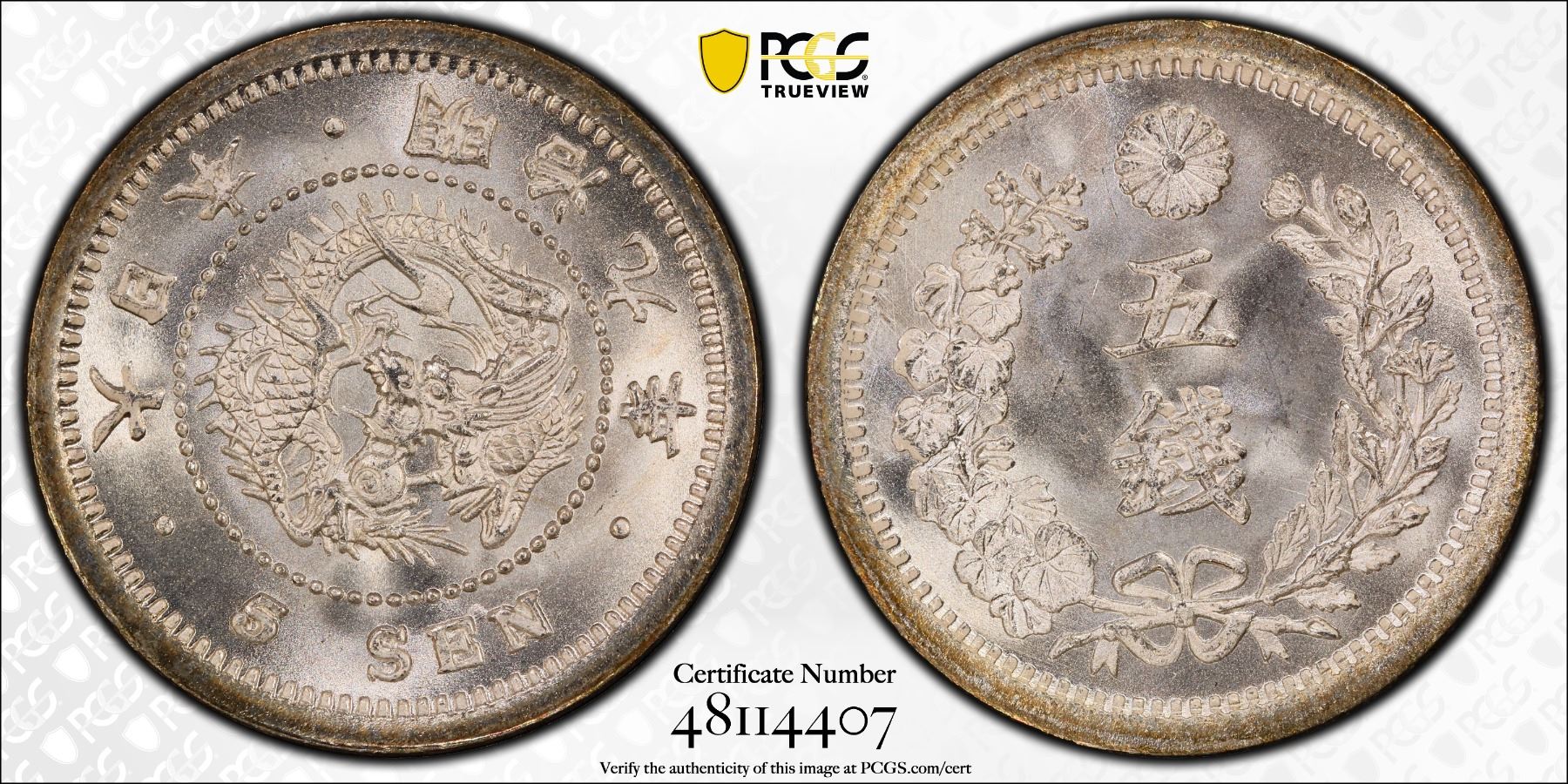 JAPAN: Meiji, 1868-1912, AR 5 sen, year 9 (1876), Y-22, JNDA-01-35, better variety with character sen connected (Type II and IV), spectacular luster, a lovely example! PCGS graded MS67.