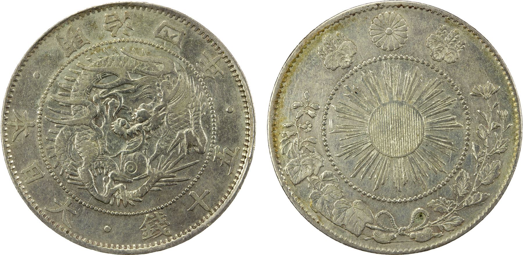 JAPAN: Meiji, 1868-1912, AR 50 sen, year 4 (1871), Y-4a.2, JNDA-01-13, 32mm large flan, 22mm inner circle, XF.