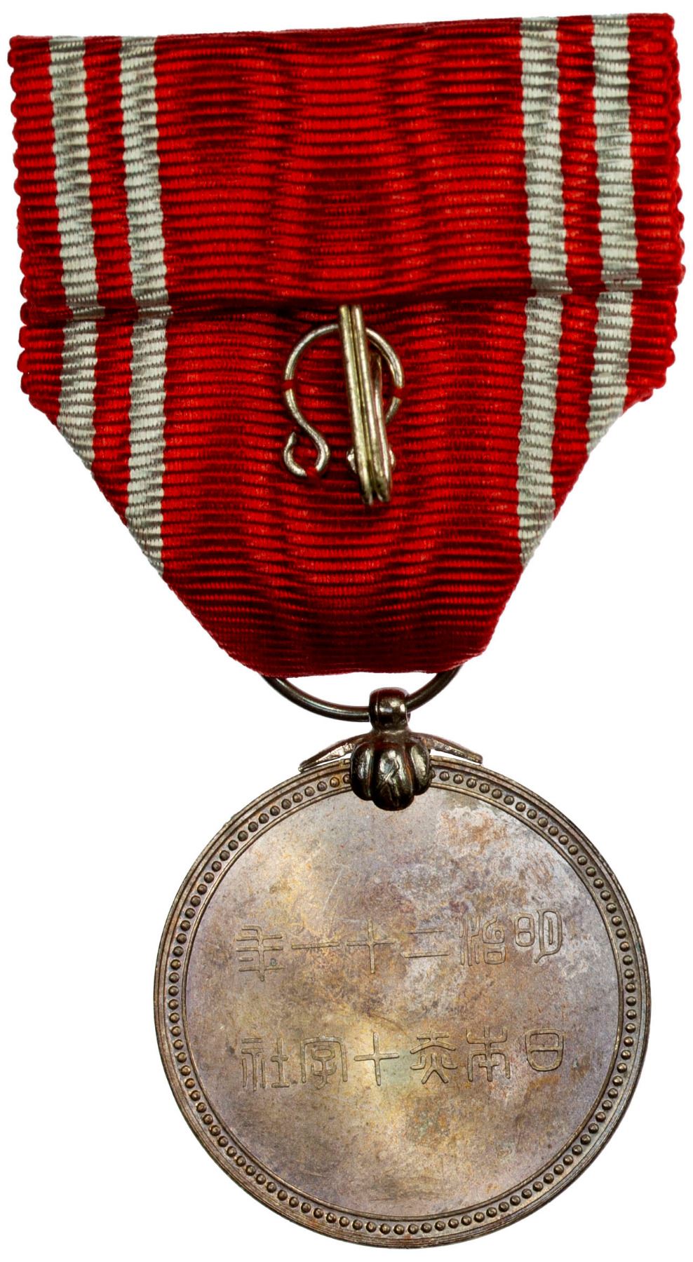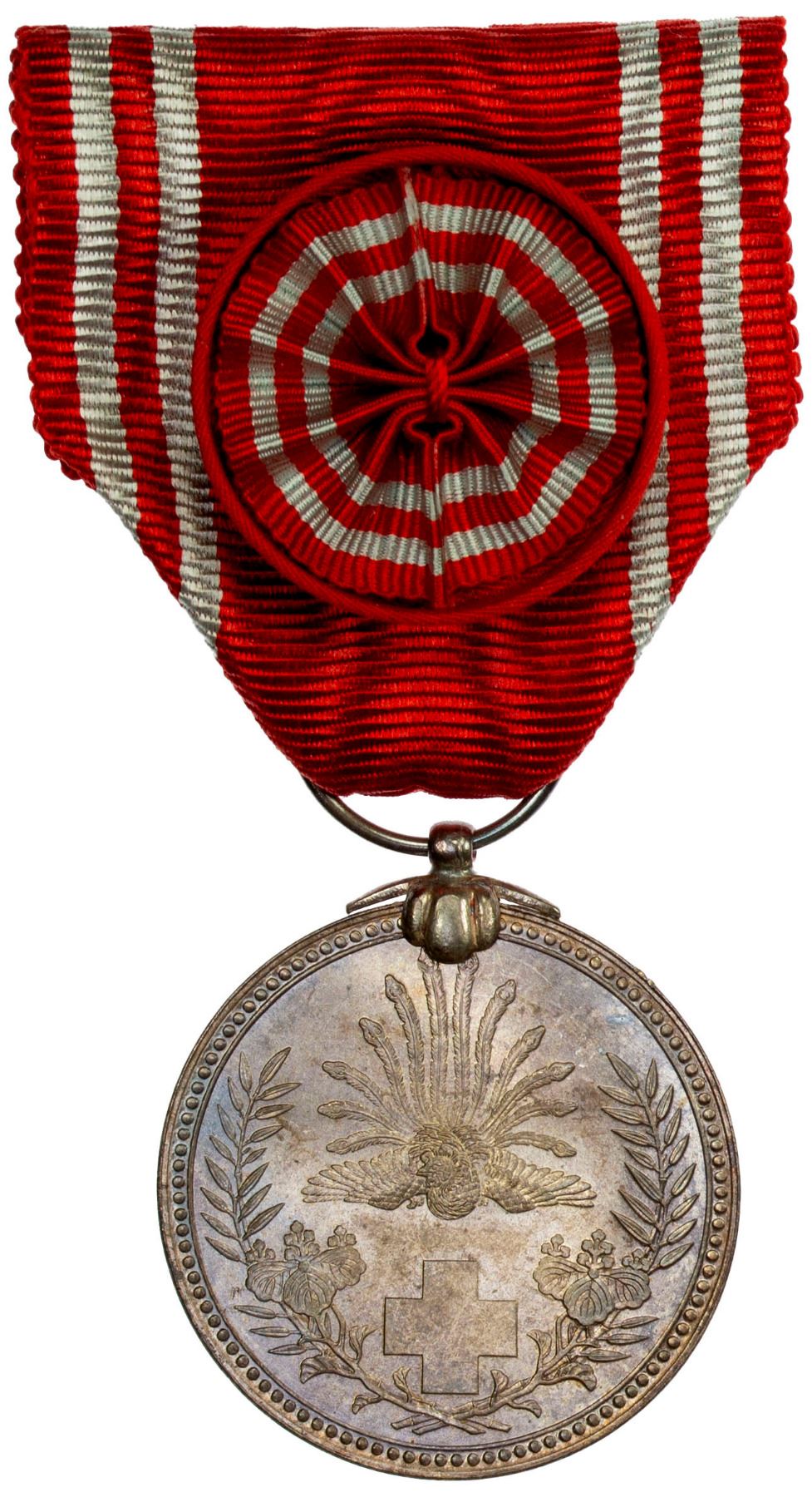 JAPAN: Meiji, 1868-1912, AR medal, year 21 (1888), Japanese Red Cross Society (Nippon Sekijujisha); Bamboo Paulownia (Kiri crest) wreath to the right and left of the Red Cross emblem, above a phoenix O-tori, all surrounded in a pearled border // MEIJI / NI / JU / ICHI / NEN / NIHON / SEKI / JU / JISHA in Japanese Kanji, Men's Special Membership Medal with large rosette on its original ribbon with hook and eye, likely issued in the Showa era, a gorgeous lustrous example! Brilliant Unc. The forerunner of the Japanese Red Cross Society, the Hakuaisha (Philanthropic Society) was founded in 1877 by Court Tsunetami Sano, to help those who were wounded in the Satsuma Rebellion earlier that year. Japan signed the Geneva Convention in 1886 and in the following year, the Hakuaisha changed its name to the Japanese Red Cross Society (Nippon Sekijujisha). It was recognized as such by the International Committee on the Red Crosson September 2, 1887. The medal was established in 1888 and comes in five classes: Member, Special Member, Life Member, Golden Special Member and Honorary Member.