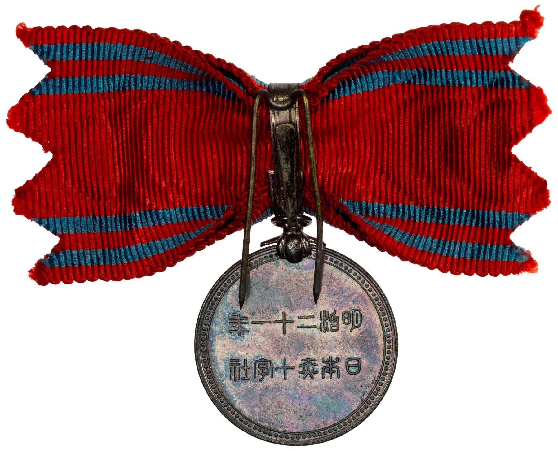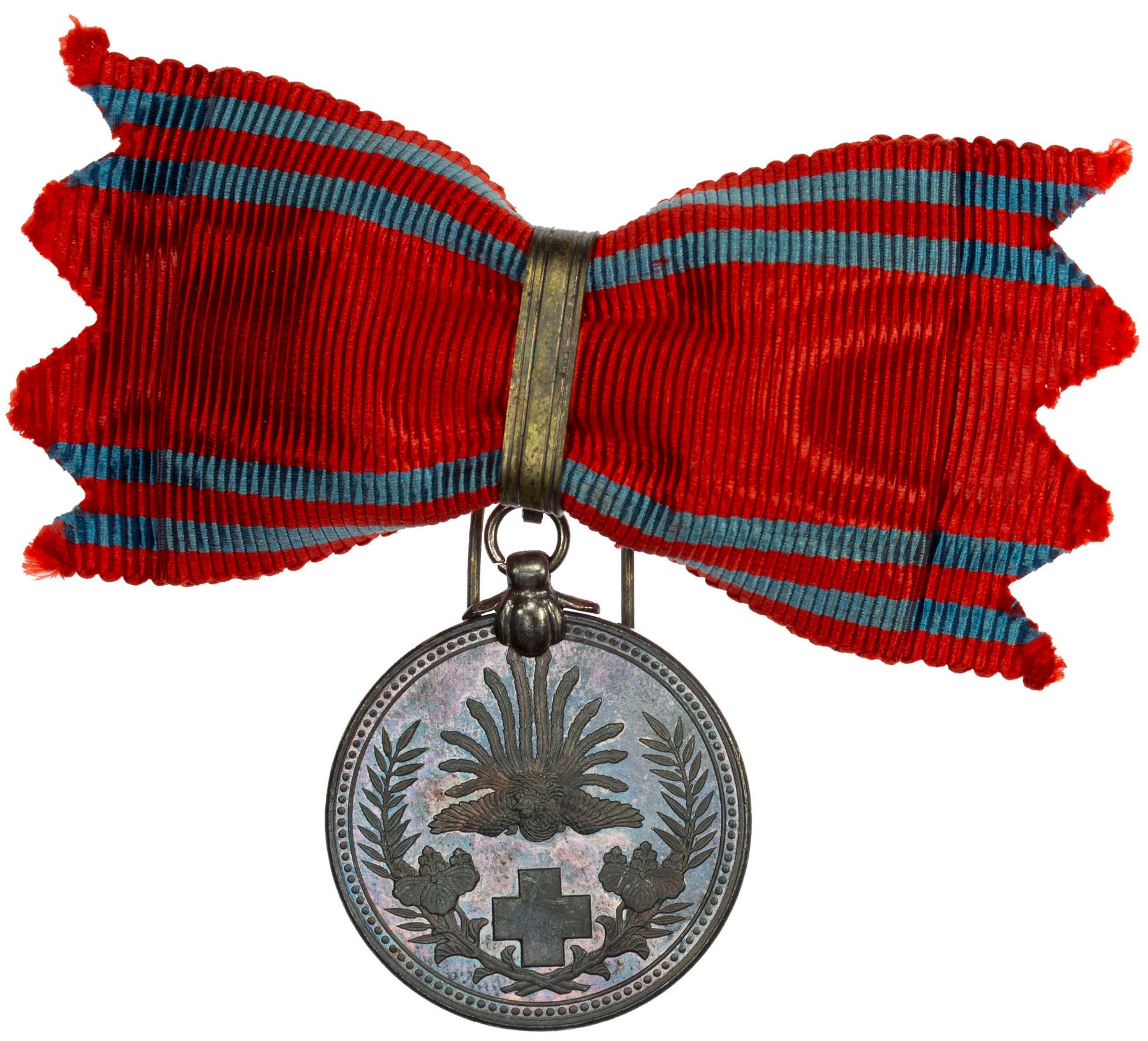 JAPAN: Meiji, 1868-1912, AR medal, year 21 (1888), Japanese Red Cross Society (Nippon Sekijujisha); Bamboo Paulownia (Kiri crest) wreath to the right and left of the Red Cross emblem, above a phoenix O-tori, all surrounded in a pearled border // MEIJI / NI / JU / ICHI / NEN / NIHON / SEKI / JU / JISHA in Japanese Kanji, Women's Membership Medal with its original bow-tied ribbon with pinback, likely issued in the Showa era, a gorgeous lustrous example! Brilliant Unc. The forerunner of the Japanese Red Cross Society, the Hakuaisha (Philanthropic Society) was founded in 1877 by Court Tsunetami Sano, to help those who were wounded in the Satsuma Rebellion earlier that year. Japan signed the Geneva Convention in 1886 and in the following year, the Hakuaisha changed its name to the Japanese Red Cross Society (Nippon Sekijujisha). It was recognized as such by the International Committee on the Red Crosson September 2, 1887. The medal was established in 1888 and comes in five classes: Member, Special Member, Life Member, Golden Special Member and Honorary Member.
