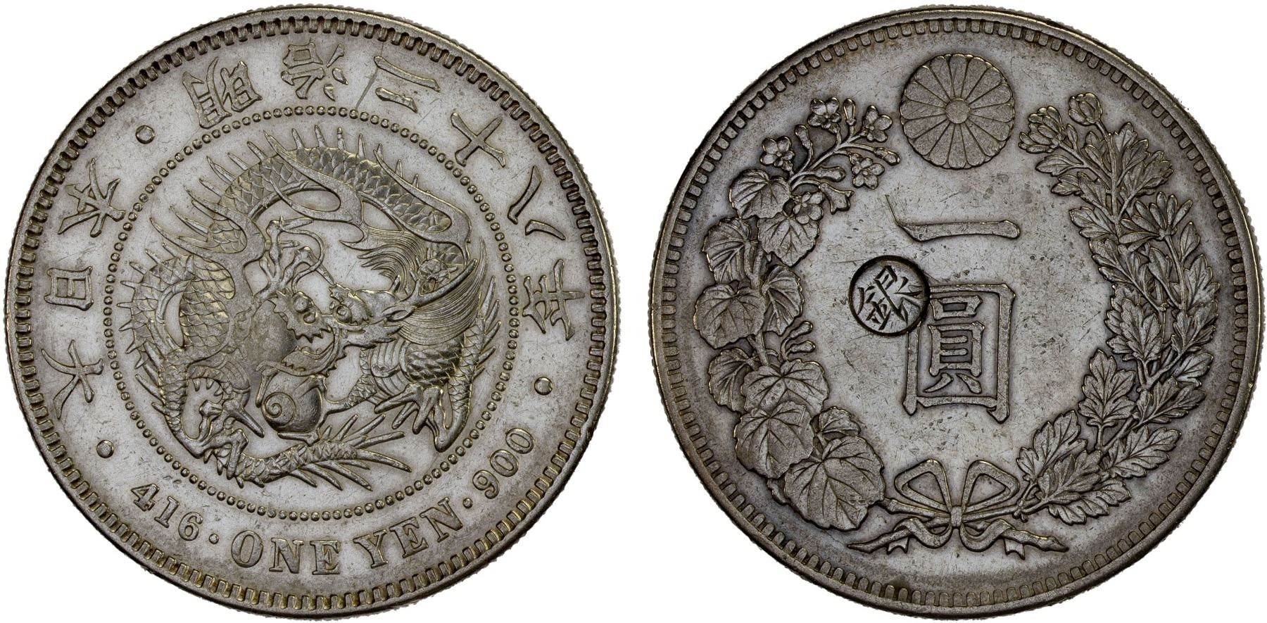 JAPAN: Meiji, 1868-1912, AR yen, year 28 (1895), Y-28a.2, JNDA-01-10C, gin countermark left, cleaned, XF. In October 1897, Japan revalued the gold yen, and changed from a combination silver/gold standard to an exclusively gold standard. For the next six months silver yen were exchangeable for gold. Part of the demonetized silver coins were melted for use in minting subsidiary coins, and the rest were shipped to Taiwan for use as bullion silver. Before being exported, they were countermarked with the character for silver (gin) in a circle, to prevent them from being returned to Japan for another shot at exchange for gold. The gin countermark appears in a specific position - to the left or right of the ichi (one) character on the reverse. Krause states that the main Mint at Osaka applied the mark on the left side, and the subsidiary Tokyo Mint applied it to the right.