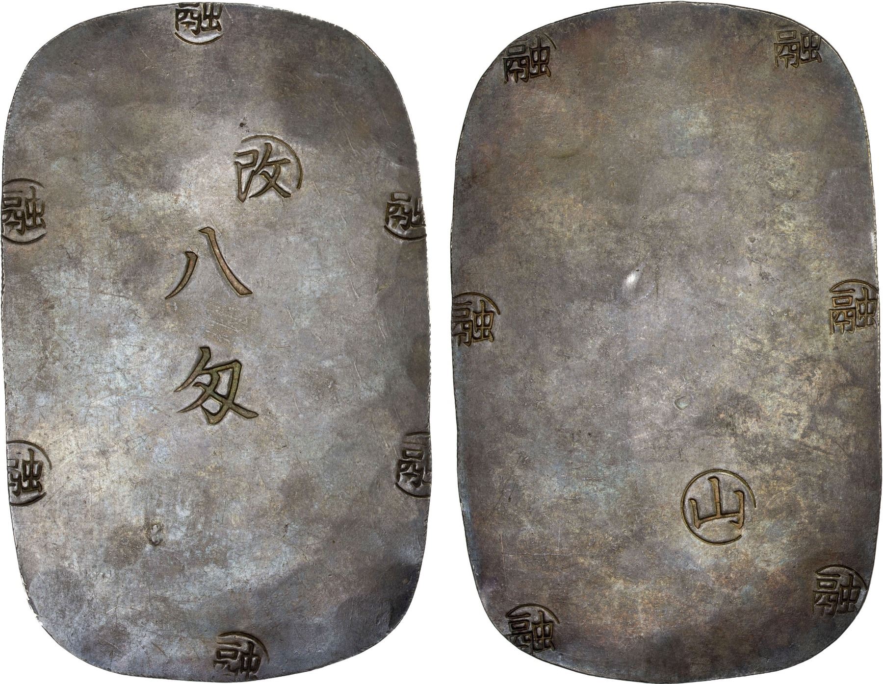 JAPAN: Morioka Domain, AR 8 momme (30.30g), ND (1868), H-9.92, KM-52, JNDA-09-73, "Morioka Ginban" type, hatchi momme at center, counterstamped kai (revised) in circle, and yu (finance) six times // yama for Yamagata Province, and yu (finance) six times, struck in 1868 to fund the Morioka clan war chest, with JNDA Certificate of Authenticity, XF. This type was struck from silver produced from the Kosaka Mine and minted from March to August 1868 at the rate of about 150 pieces per day. Due to the many surviving pieces that are in good quality, it is likely that they were in circulation for a very short time, or found only very limited circulation during the brief Boshin War.