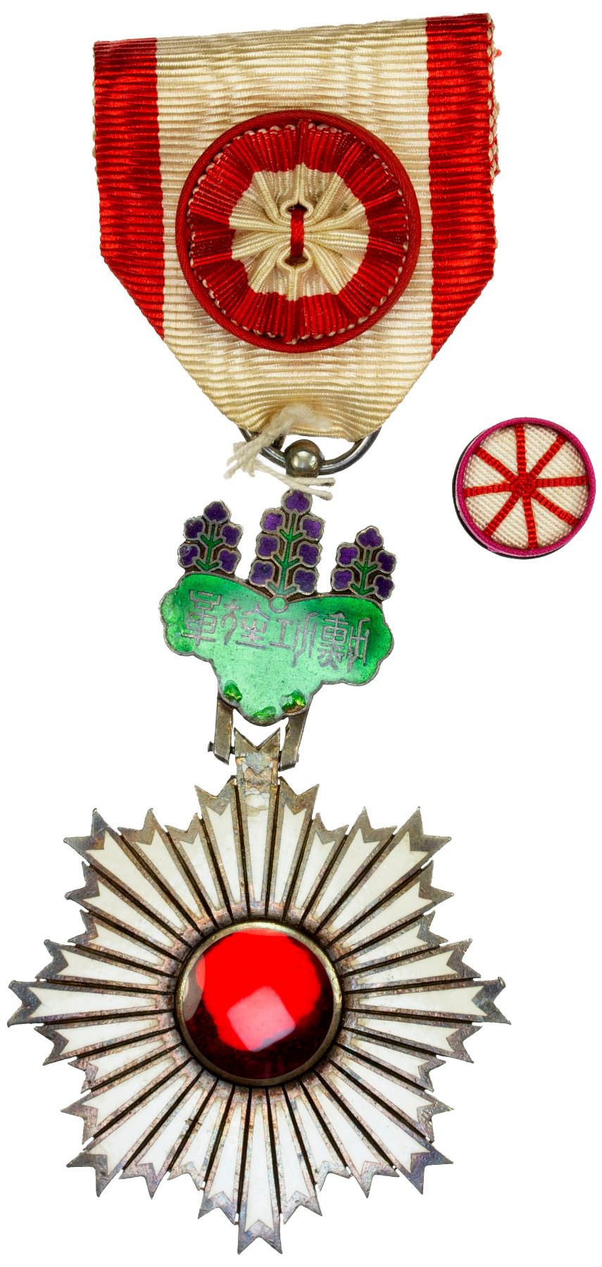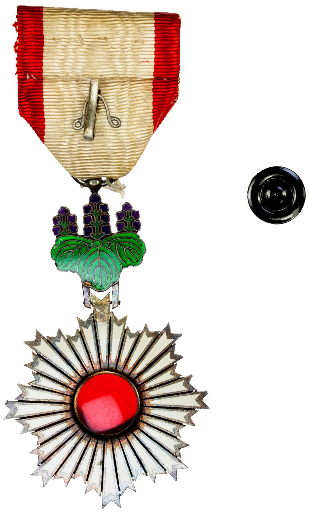JAPAN: Order of the Rising Sun, enameled AR medal, 4th Class; red glass centerpiece and a white star with the star affixed to a green paulownia flower suspension consisting of three groupings of purple flowers, with period lapel pin, and ribbon with a hook and eye, in original case of issue, likely issued in WWII, XF. The Order of the Rising Sun (Kyokujitsu-sho) is a Japanese order established on 10 April 1875 by decree of the Council of State. The Order was the first national decoration awarded by the Japanese government. The order is conferred upon those who have made distinguished achievements in international relations, promotion of Japanese culture, advancements in their field, development in welfare, or preservation of the environment. Prior to the end of World War II, it was also awarded for exemplary military service.