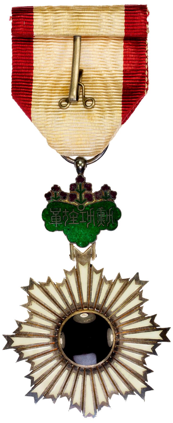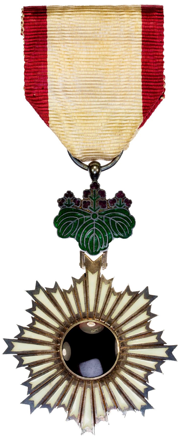 JAPAN: Order of the Rising Sun, enameled AR medal, 6th Class; red glass centerpiece and a white star with the star affixed to a green paulownia flower suspension consisting of three groupings of purple flowers, with period lapel pin, and ribbon with a hook and eye, in original case of issue, likely issued in WWII, XF. The Order of the Rising Sun (Kyokujitsu-sho) is a Japanese order established on 10 April 1875 by decree of the Council of State. The Order was the first national decoration awarded by the Japanese government. The order is conferred upon those who have made distinguished achievements in international relations, promotion of Japanese culture, advancements in their field, development in welfare, or preservation of the environment. Prior to the end of World War II, it was also awarded for exemplary military service.
