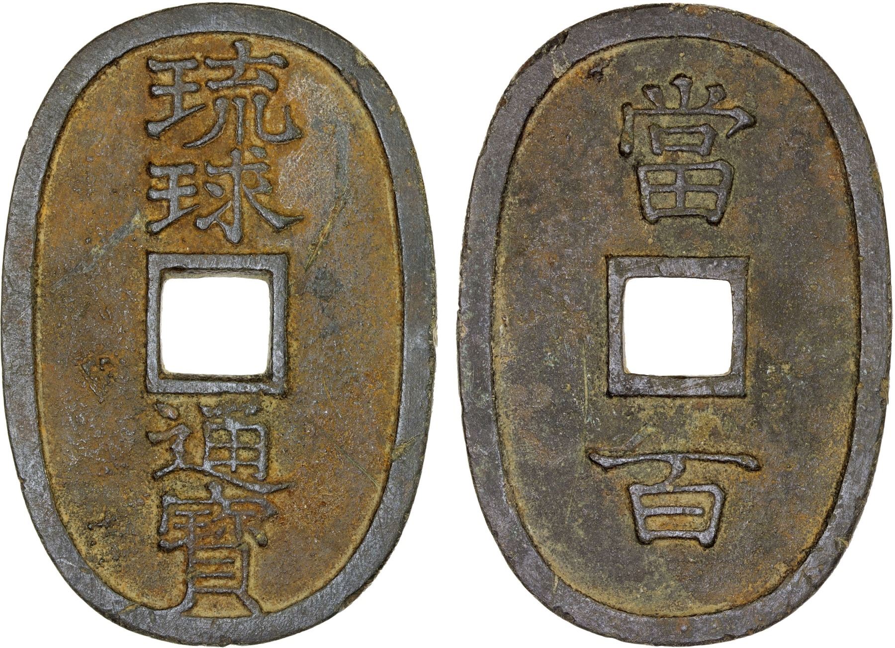 JAPAN: Ryukyus: Sho Tai, 1848-1879, AE 100 mon (20.46g), H-6.28, JNDA-138.1, VF. These coins were minted in the Ryukyu era year 2-3 (1862-63) by the Shimazu clan at Isonohama, near Kagoshima, the political center for Satsuma and also for the Ryukyu. Ryukyu traders and emissaries frequented the city, and a special Ryukyu embassy building was established there. The coins were originally intended for trade with the Ryukyu, but apparently were little used there. It is said that their production was a smokescreen to hide the production of illegal Tempo Tsuho value 100 coins.