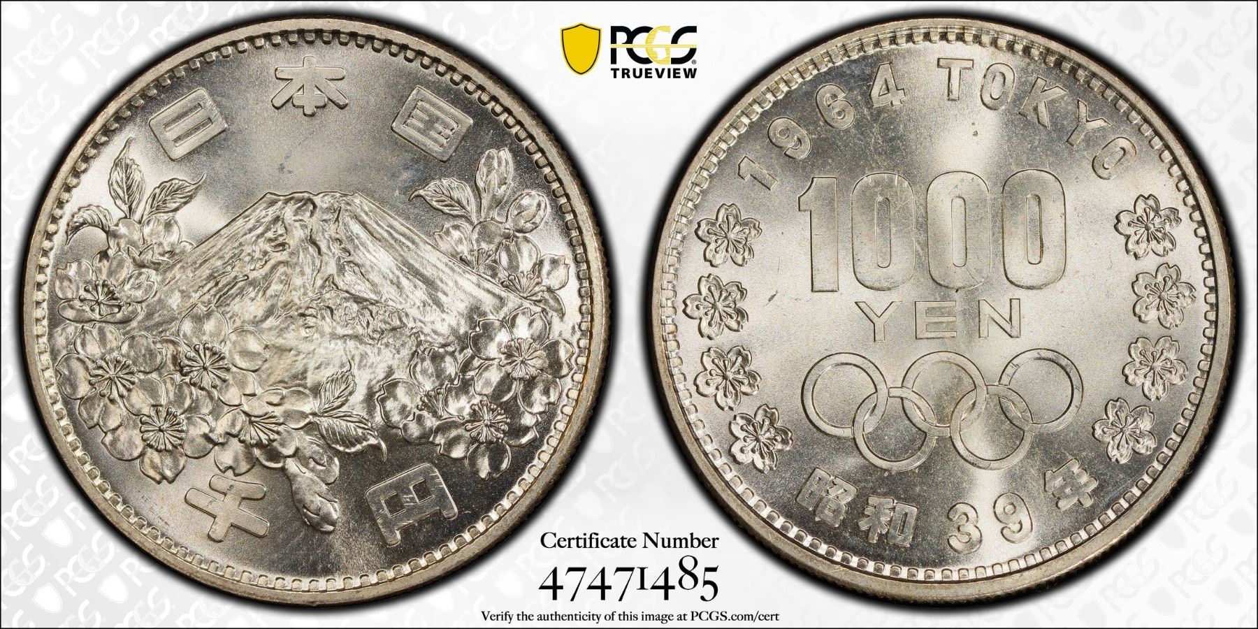 JAPAN: Showa, 1926-1989, AR 1000 yen, year 39 (1964), Y-80, JNDA-03-1, Summer Olympics Games in Tokyo, Mt. Fuji with cherry blossoms, splendid radiant luster, PCGS graded MS67.