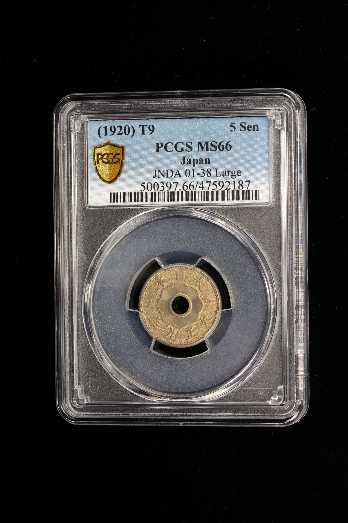 JAPAN: Taisho, 1912-1926, 5 sen, year 9 (1920), Y-43, JNDA-01-38, large type, brilliant luster, PCGS graded MS66.