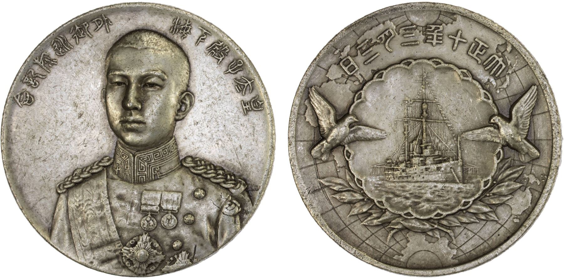 JAPAN: Taisho, 1912-1926, silvered AE medal, year 10 (1921), Zeno-151842, 61mm silvered bronze medal by S. Nakano, depicting Crown Prince Hirohito (the later Emperor Showa) on the obverse with inscription above "In Commemoration of the Overseas Expedition [Voyage] of HRH the Crown Prince" // the battleship Katori with doves to either side, date above, superimposed over a globe with voyage departure date above, with Osaka Mint hallmark on edge. In 1920 the Crown Prince Hirohito was promoted to the rank of Major in the army and Lieutenant Commander in the navy. In 1921, from March 3 until September 3, Hirohito took a six-month tour of Europe onboard the battleship Katori, including the United Kingdom, France, Italy, the Netherlands and Belgium. He was the first Japanese crown prince to travel abroad. After his return to Japan at the age of 20 he became Regent of Japan on November 25, 1921, in place of his ailing father who was affected by a mental illness. The Katori was the lead ship of the two pre-dreadnought battleships designed and built for the Empire of Japan by the British shipyard Vickers. The ship was disarmed and scrapped by 1925 in accordance with the terms of the Washington Naval Treaty of 1922. This medal also exists in silver.