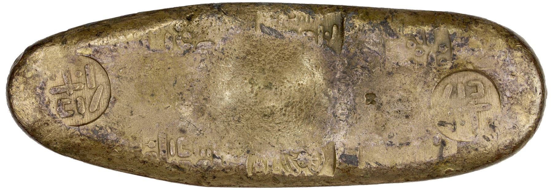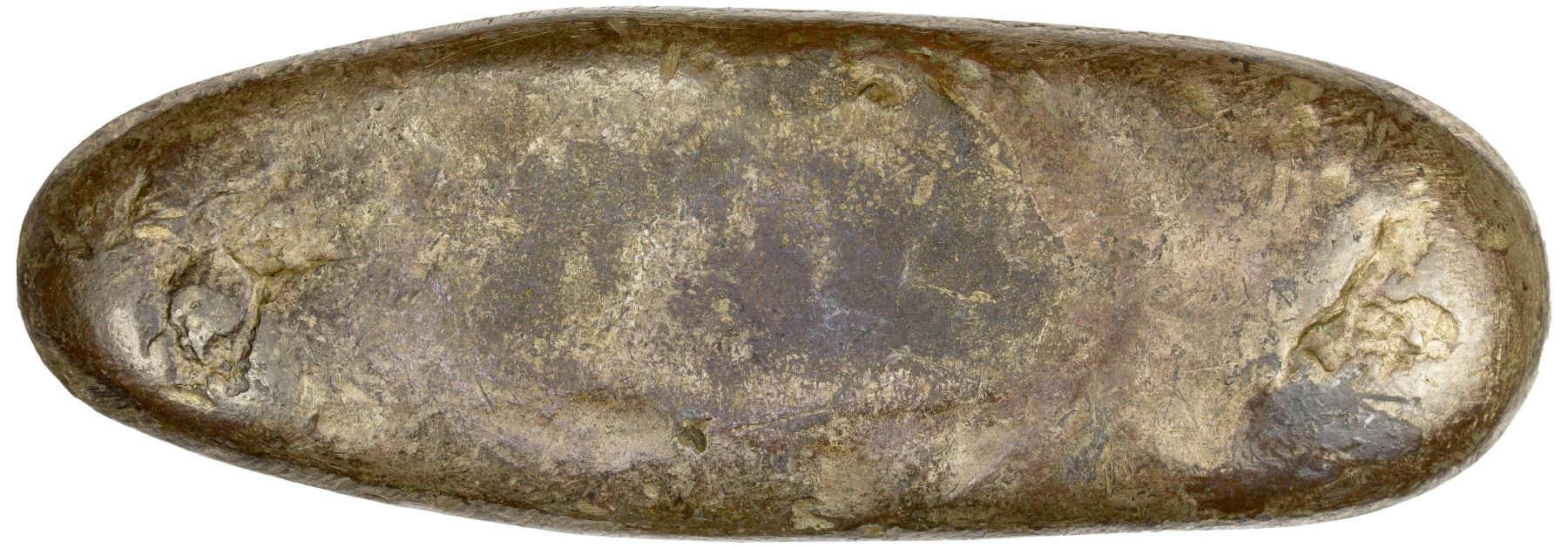 JAPAN: Tenpo, 1830-1844, AR chogin (124.07g), Edo Mint, H-9.50, Cr-9b, JNDA-09-68, stamped 6 times with daikoku (God of Wealth), with character po stamped at both ends, 0.260 fine silver, struck 1837-58, bold strike for type, XF The chogin were various silver ingots shaped like a sea cucumber, which did not have a face value and were valued by weight. This was the same for the mameita-gin of various sizes as well. These types were stamped with the Japanese era name at the time of manufacture.