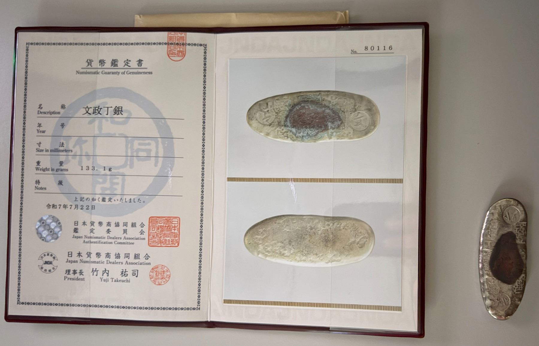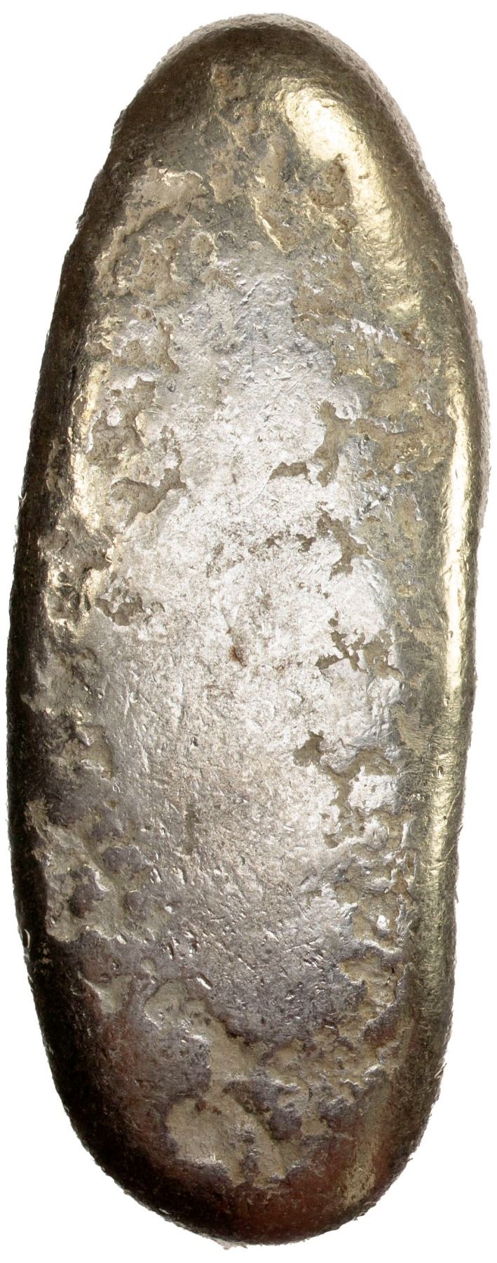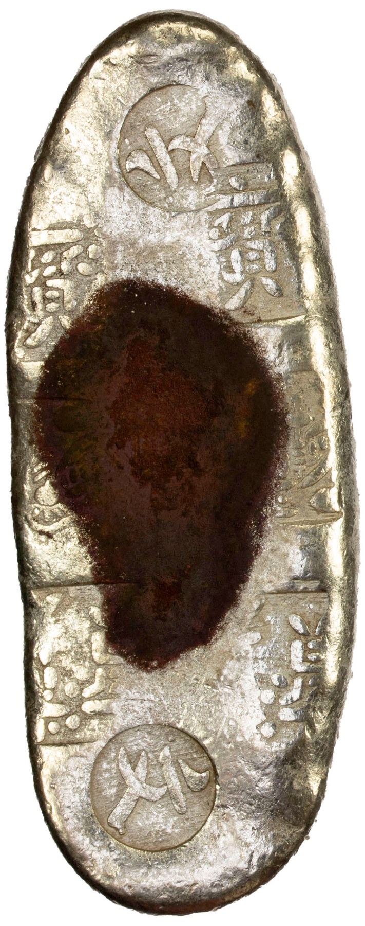 JAPAN: Tenpo, 1830-1844, AR chogin (133.21g), Edo Mint, H-9.50, Cr-9b, JNDA-09-68, stamped with Daikoku (God of Wealth) six times, with character po stamped at both ends, struck 1837-58, with JNDA Certificate of Authenticity, stain at center but a well-struck high quality example, VF-XF. The chogin were various silver ingots shaped like a sea cucumber, which did not have a face value and were valued by weight. This was the same for the mameita gin of various sizes as well. These types were stamped with the Japanese era name at the time of manufacture.