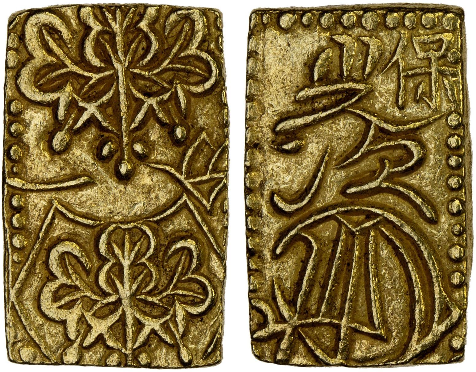JAPAN: Tenpo, 1830-1844, AV bu (2.78g), Edo Mint, H-8.44, JNDA-09-39, struck 1837-58, fan-shaped kiri crest above and below, ichi bu at center // Mitsutsugu signature, po at upper right, lightly cleaned, XF.