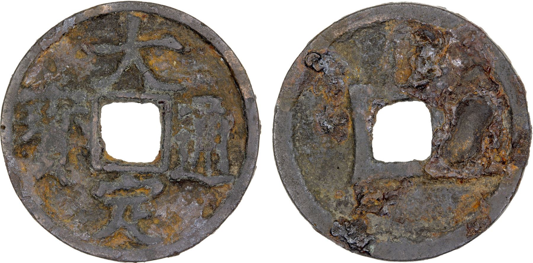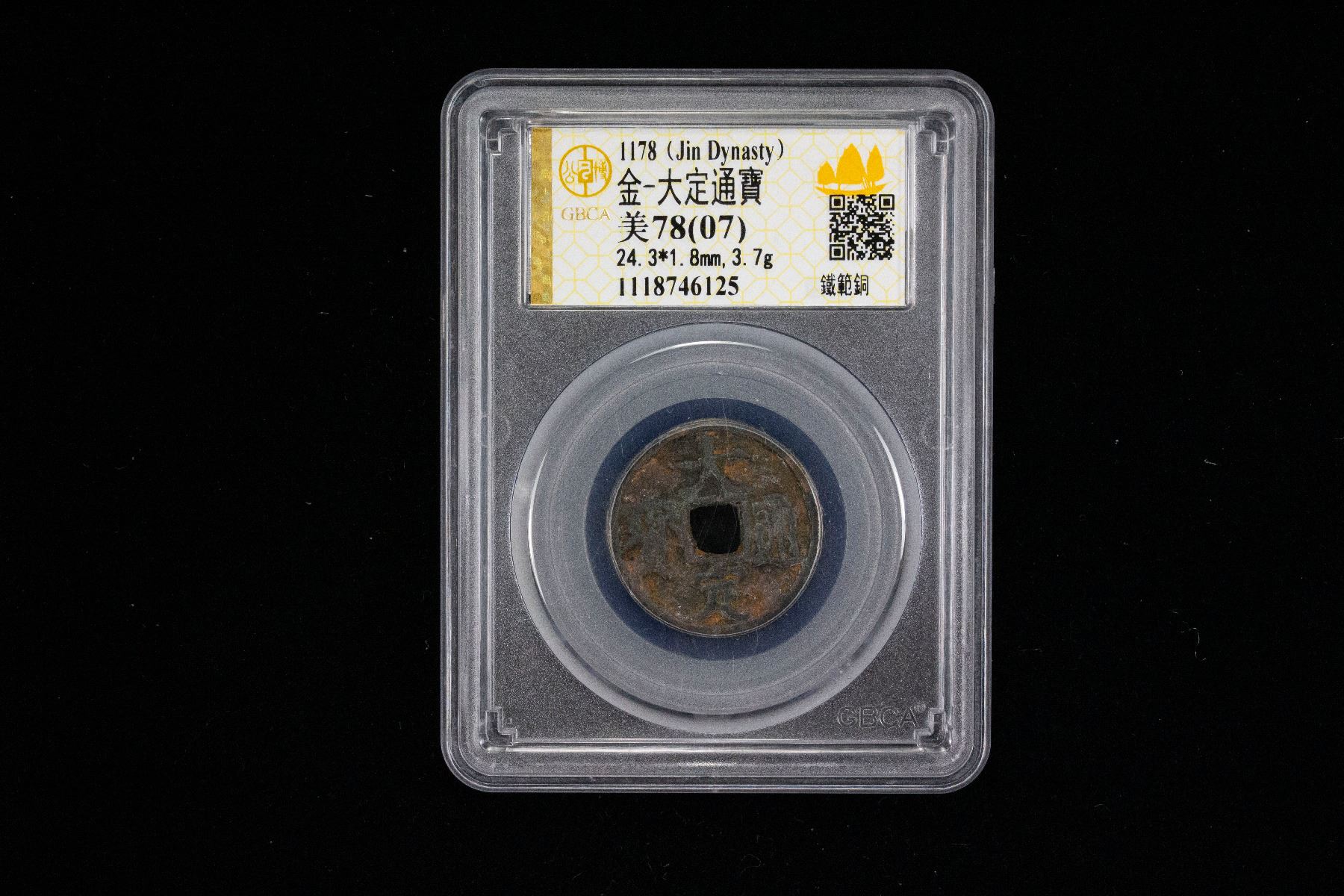 JIN: Da Ding, 1178-1189, AE cash (2.4g), H-18.56, protruded corners of the reverse central hole, tie mu "iron mother", a copper mother coin for the iron coin type, graded 78(07) by GBCA Grading Company, natural casting defects, Fine to VF, ex Dr. Dirk Löer Collection