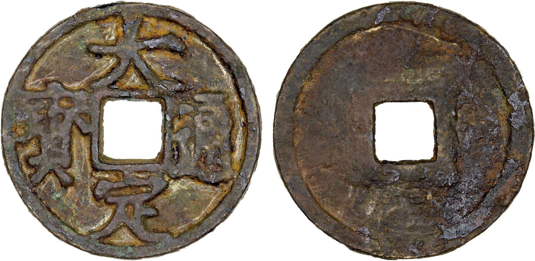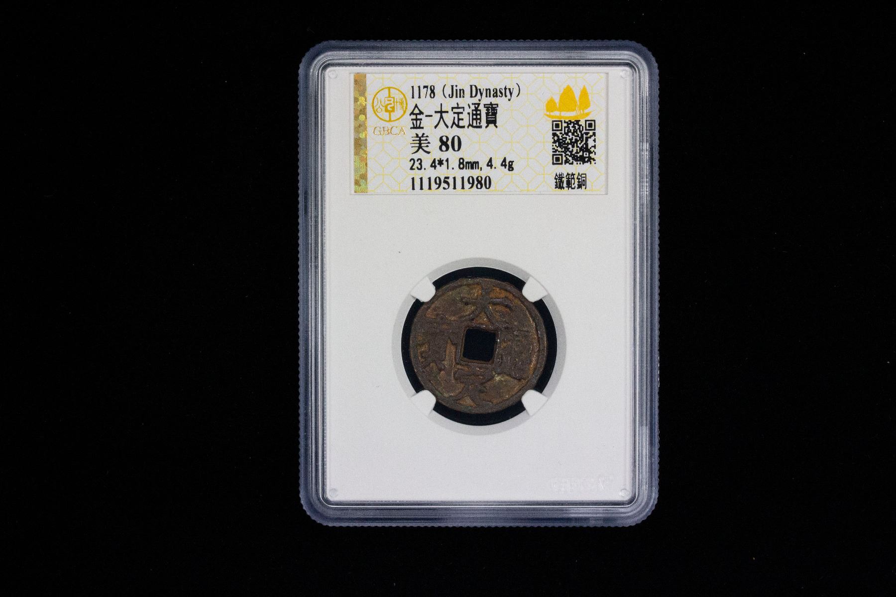 JIN: Da Ding, 1178-1189, AE cash (4.4g), H-18.56, protrusions from the corners of the reverse central hole, a likely tie mu "iron mother", a copper mother coin for the iron coin type, graded 80 by GBCA Grading Company, VF, ex Dr. Dirk Löer Collection.