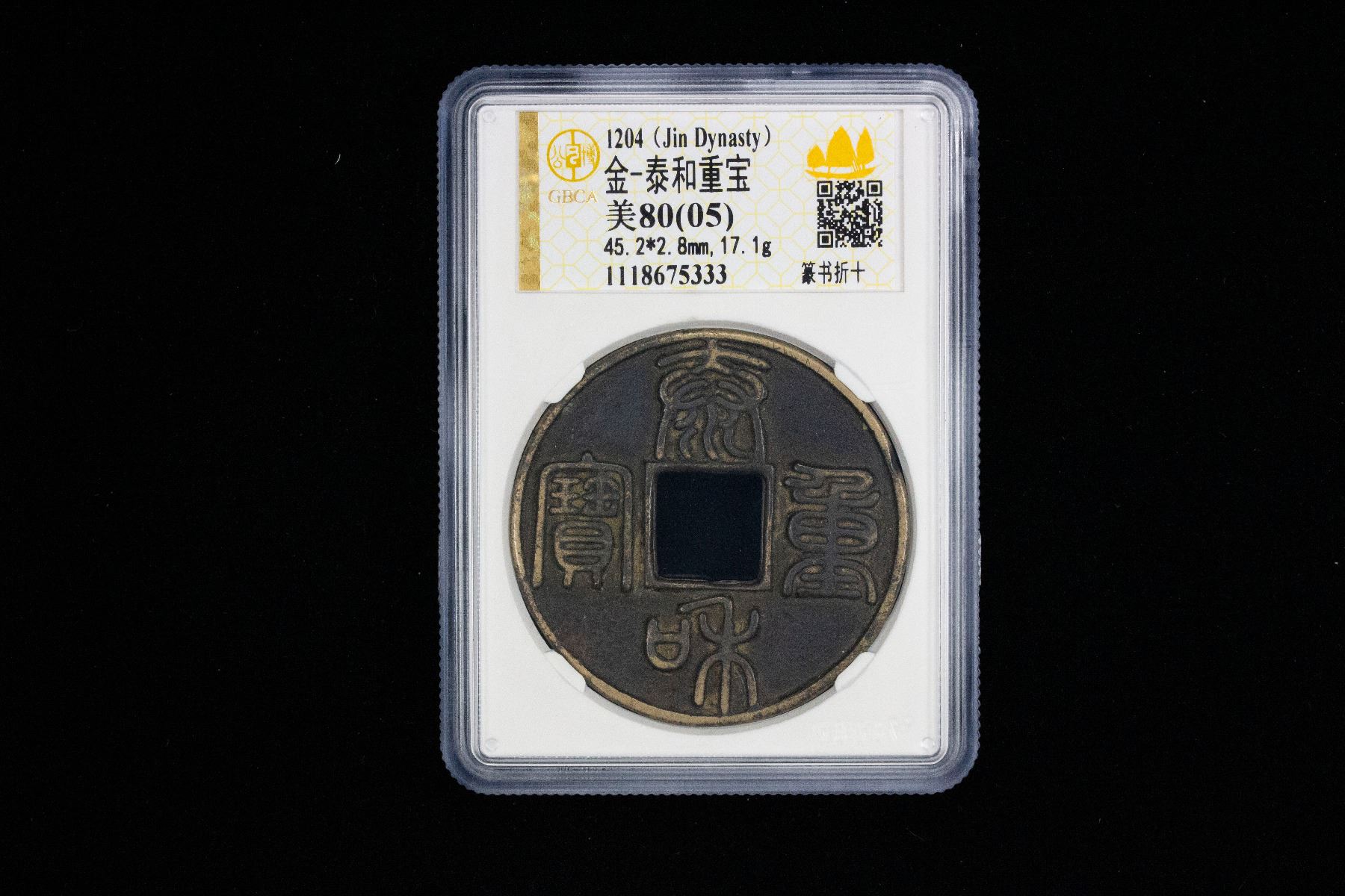JIN: Tai He, 1204-1209, AE 10 cash (17.1g), H-18.63, seal script, graded 80(05) by GBCA Grading Company, natural flan crack, VF, ex Dr. Dirk Löer Collection, ex Champion Hong Kong Auction 5 April 2011, Lot 209.