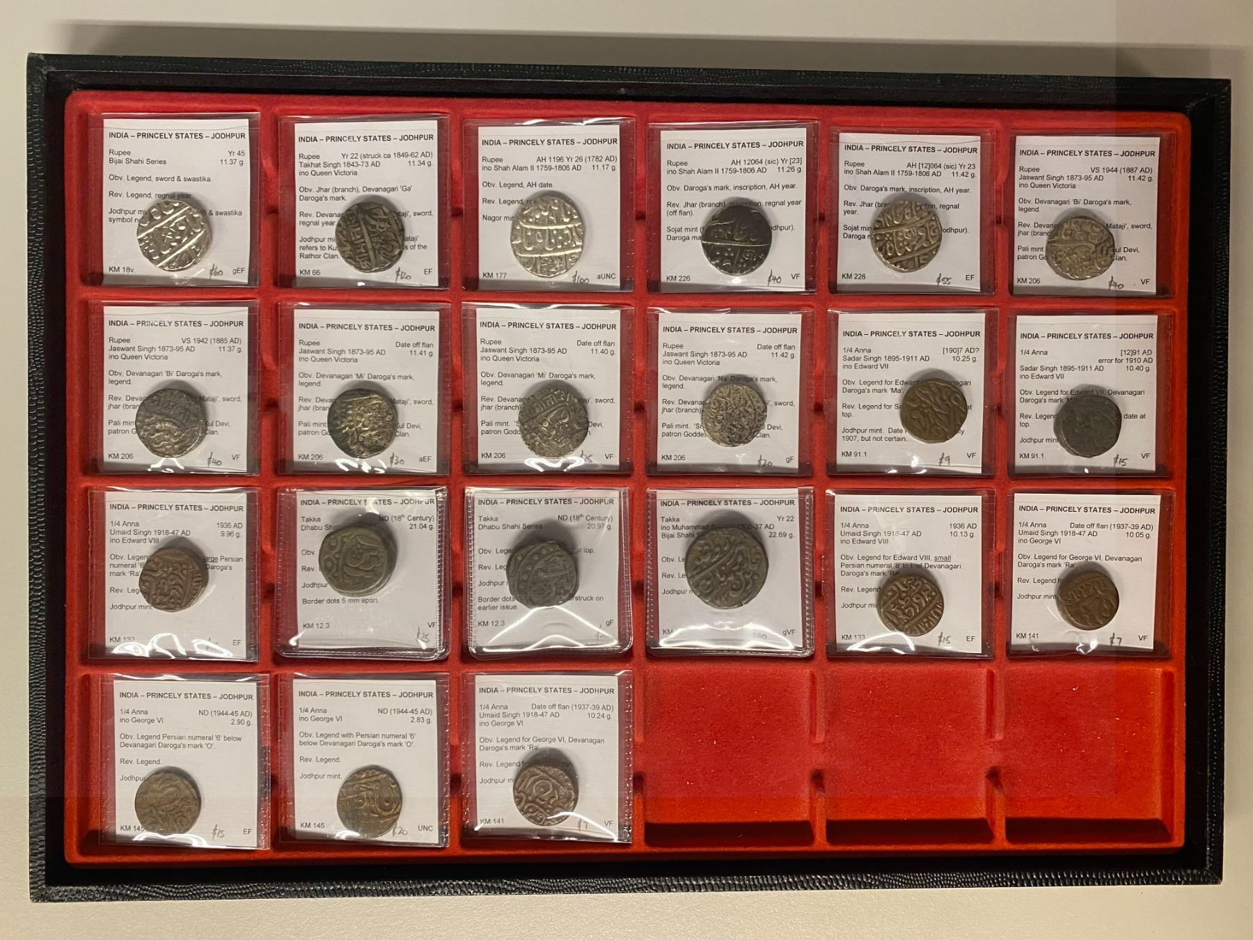JODHPUR: LOT of 10 silver & 11 copper coins, Silver: KM-18, 56, 177, 206 (5 pcs), and 226 (2), average VF-EF condition, including the mints of Jodhpur, Nagor, Pali, and Sojat; and Copper: KM-12.3 (2 pcs), 32, 91.1 (2), 132, 133, 141 (2), and 145 (2); average VF condition, no junk; all fully identified by the consignor; retail value $425, lot of 21 pieces, ex Ian Todd Collection.