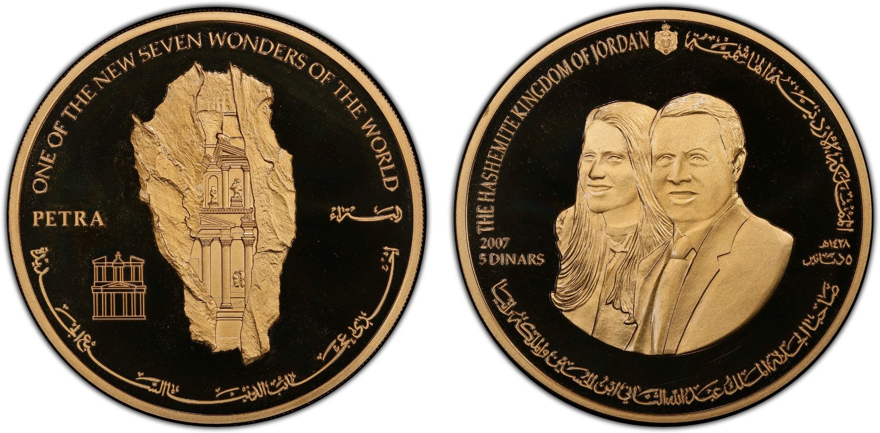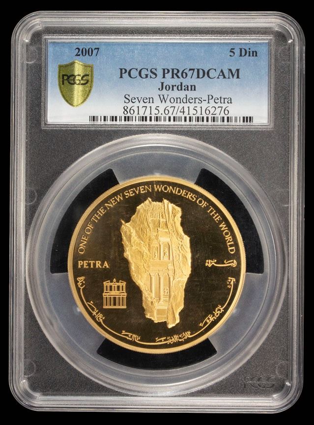 JORDAN: Abdullah II, 1999-, gilt AE 5 dinars, 2007/AH1427, KM-86a, 60mm, Selection of Petra as One of the New Seven Wonders of the World, a scarce modern issue with a mintage of only 500 coins, rare, PCGS graded PF67 Cameo.