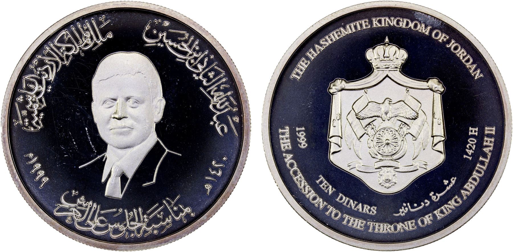 JORDAN: Abdullah Ibn Al-Hussain, 1999-, AR 10 dinars, 1999/AH1420, KM-80, Abdullah II's Accession to the Throne, a few light obverse hairlines, mintage of only 2,000 pieces, Proof, S, ex Wolfgang Schuster Collection.
