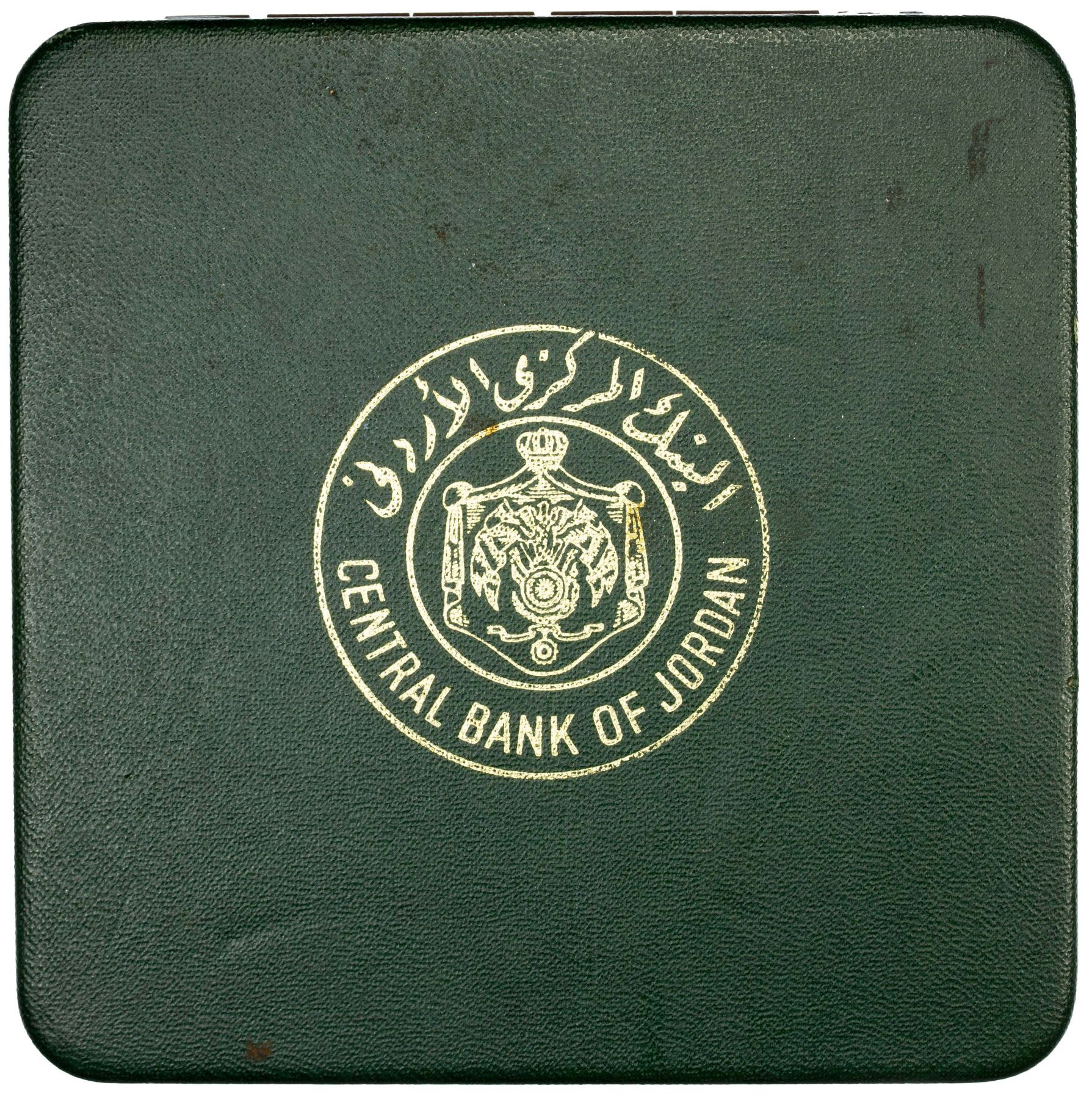 JORDAN: Hussain, 1952-1999, 6-coin specimen set, 1968/AH1387, KM-SS3, set includes, 1, 5, 10, 20, 50 and 100 fils coins, in original Central Bank of Jordan plush green case of issue, mintage of only 50 sets, very rare, some spotting, set of 6 coins.