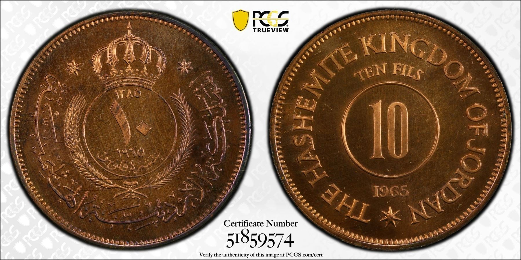 JORDAN: Hussain b. Talal, 1952-1999, AE 10 fils, 1965/AH1385, KM-4, a superb example, PCGS graded PF65 RB, ex Almer H. Orr III Collection.