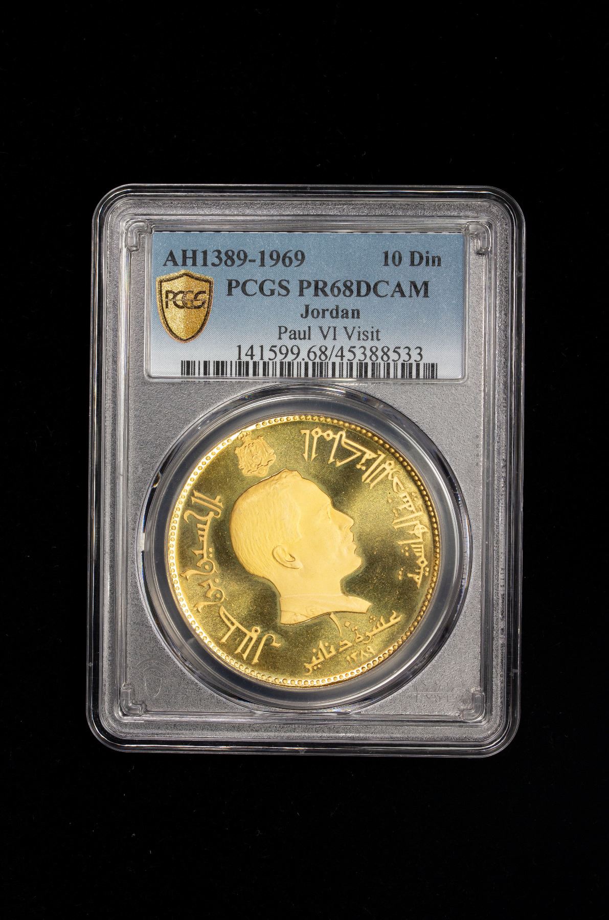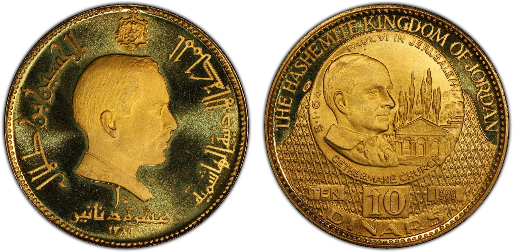 JORDAN: Hussain b. Talal, 1952-1999, AV 10 dinars, 1969/AH1389, Ra-26, Visit of Pope Paul VI, mintage of only 1,870 pieces, PCGS graded Proof 68 DCAM, Scarce.