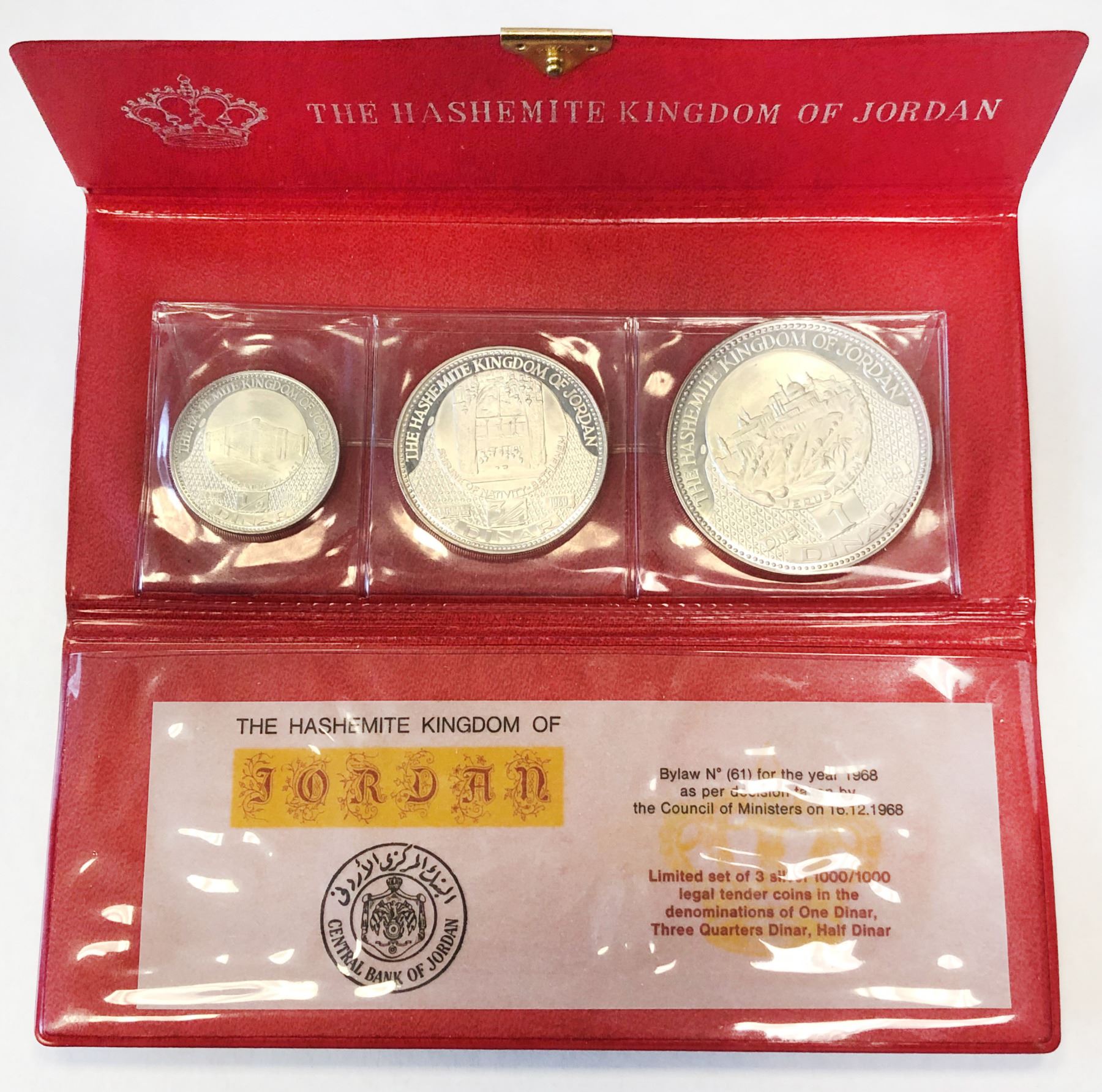 JORDAN: Hussein bin Talal, 1952-1999, 3-coin proof set, 1969/AH1389, KM-PS6, includes the following silver coins: ½ dinar - Al Harraneh Palace, ¾ dinar - Shrine of the Nativity in Bethlehem, 1 dinar - Jerusalem, all set in the original Central Bank of Jordan case of issue with COA, set of 3 coins, Proof.