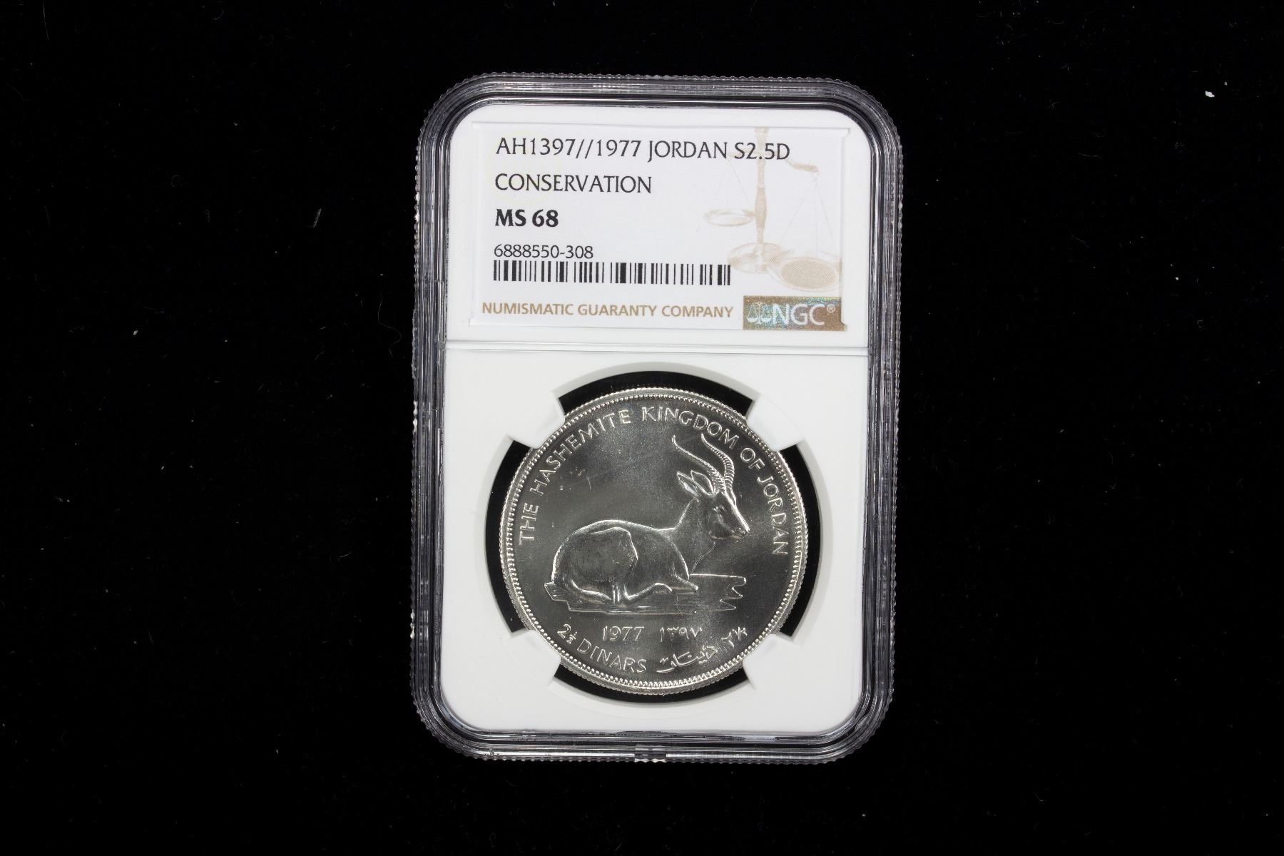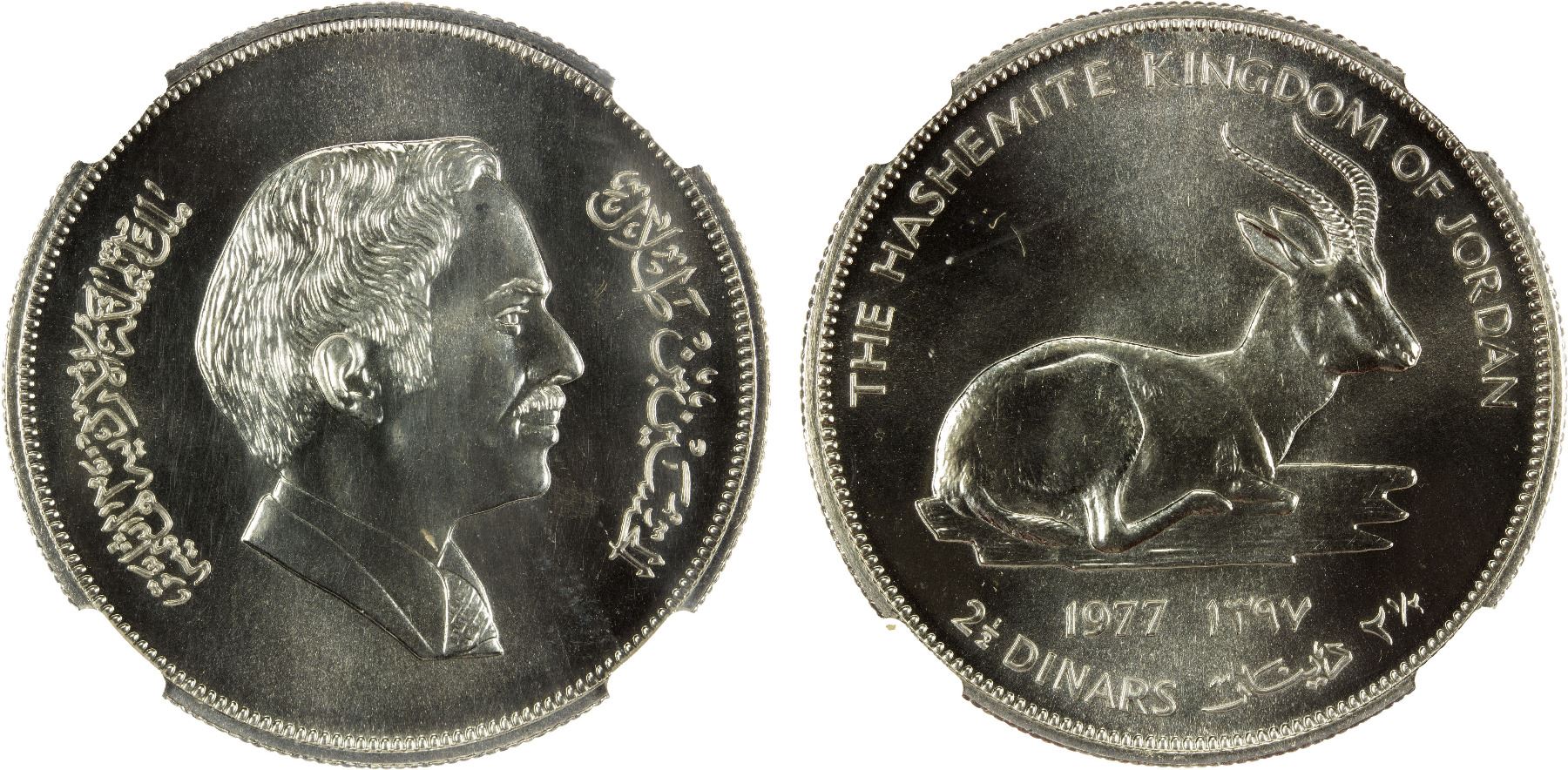 JORDAN: Hussein bin Talal, 1952-1999, AR 2½ dinars, 1977, KM-31, Conservation series - Rhim Gazelle, a spectacular example, NGC graded MS68.
