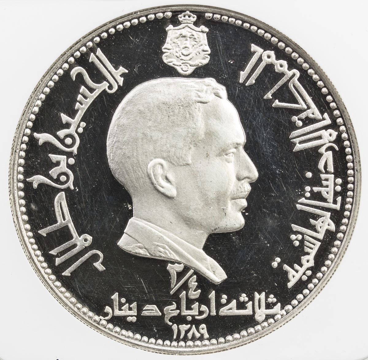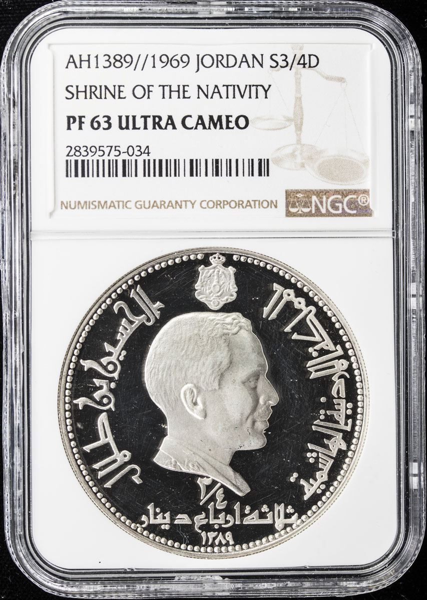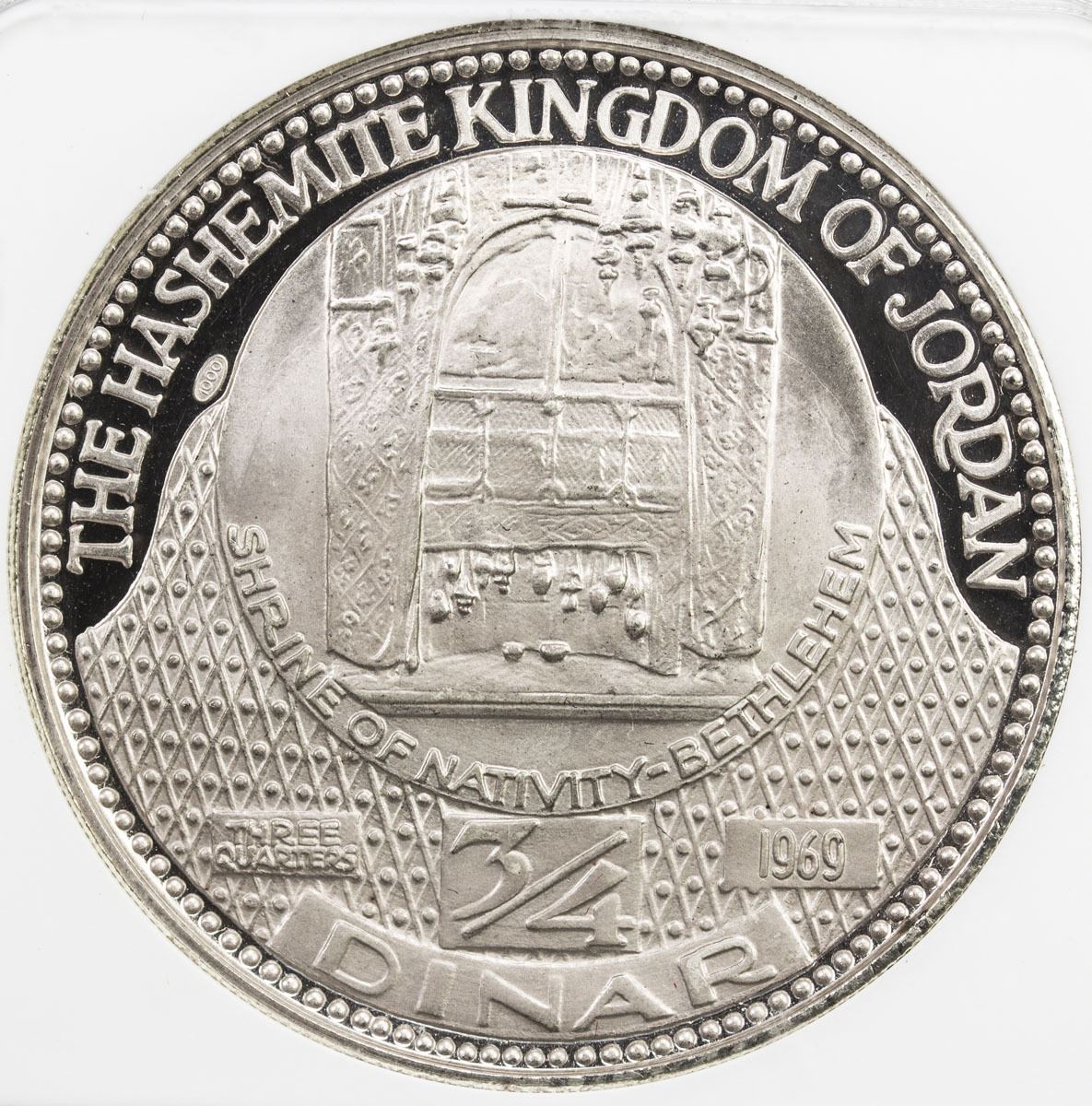 JORDAN: Hussein bin Talal, 1952-1999, AR 3/4 dinar, 1969/AH1389, KM-22, Shrine of the Nativity - Bethlehem, Italcambio Mint issue, NGC graded PF63 UC.