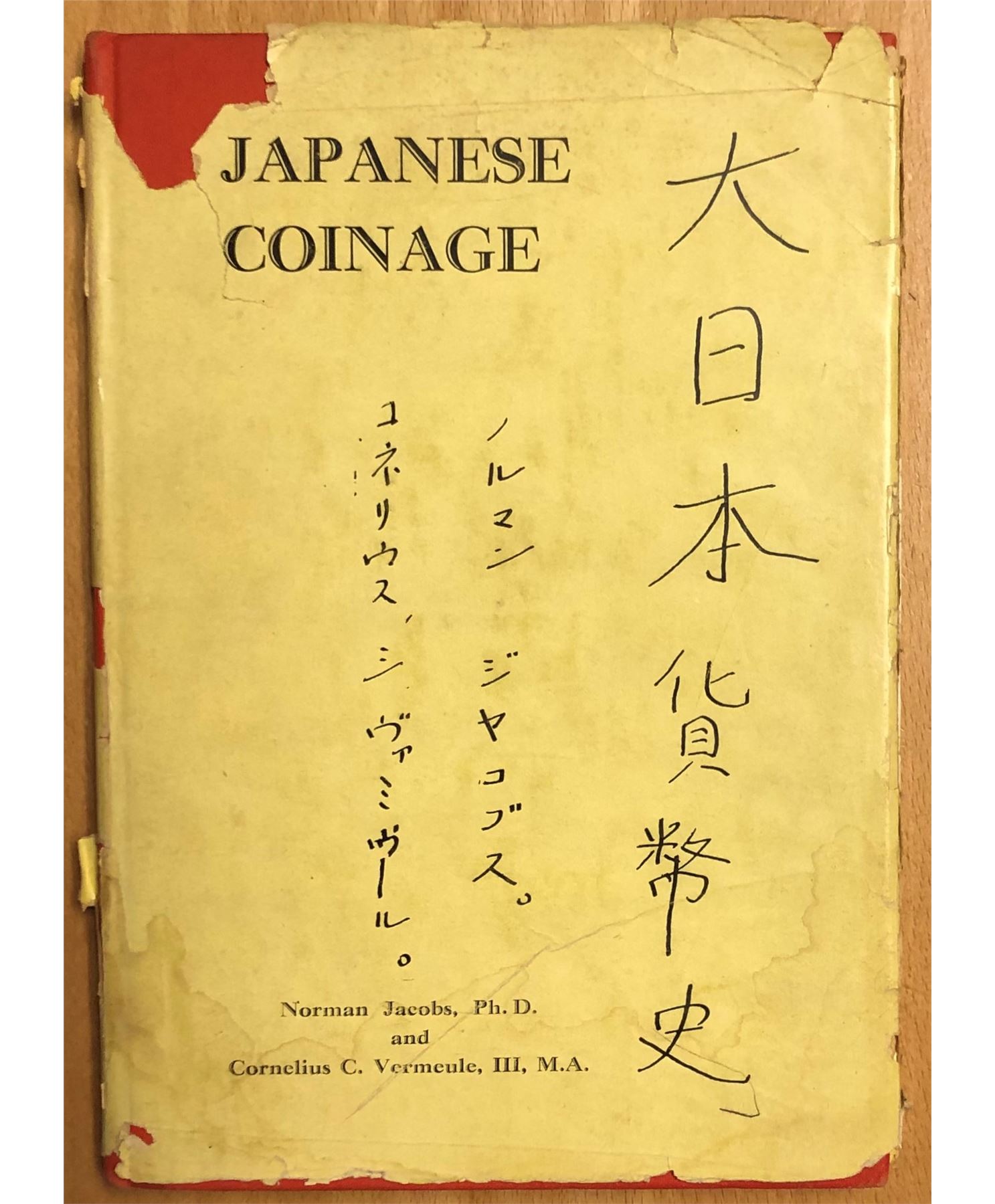 Jacobs, Norman and Cornelius C. Vermeule, III, Japanese Coinage, Numismatic Review, New York, 1953, 135 pages, hardcover with torn dust jacket. Essentially two books in one on the coinage of Japan. Part one is a monetary history of Japan from the earliest times to the present by Vermeule. Part two is a catalogue of the coins of Japan, Modern Korea and Manchukuo by Jacobs. There are reasonable photos, but some would make it difficult to identify the coins. There is a 1953 valuation guide inserted, ex James Farr Collection Library.