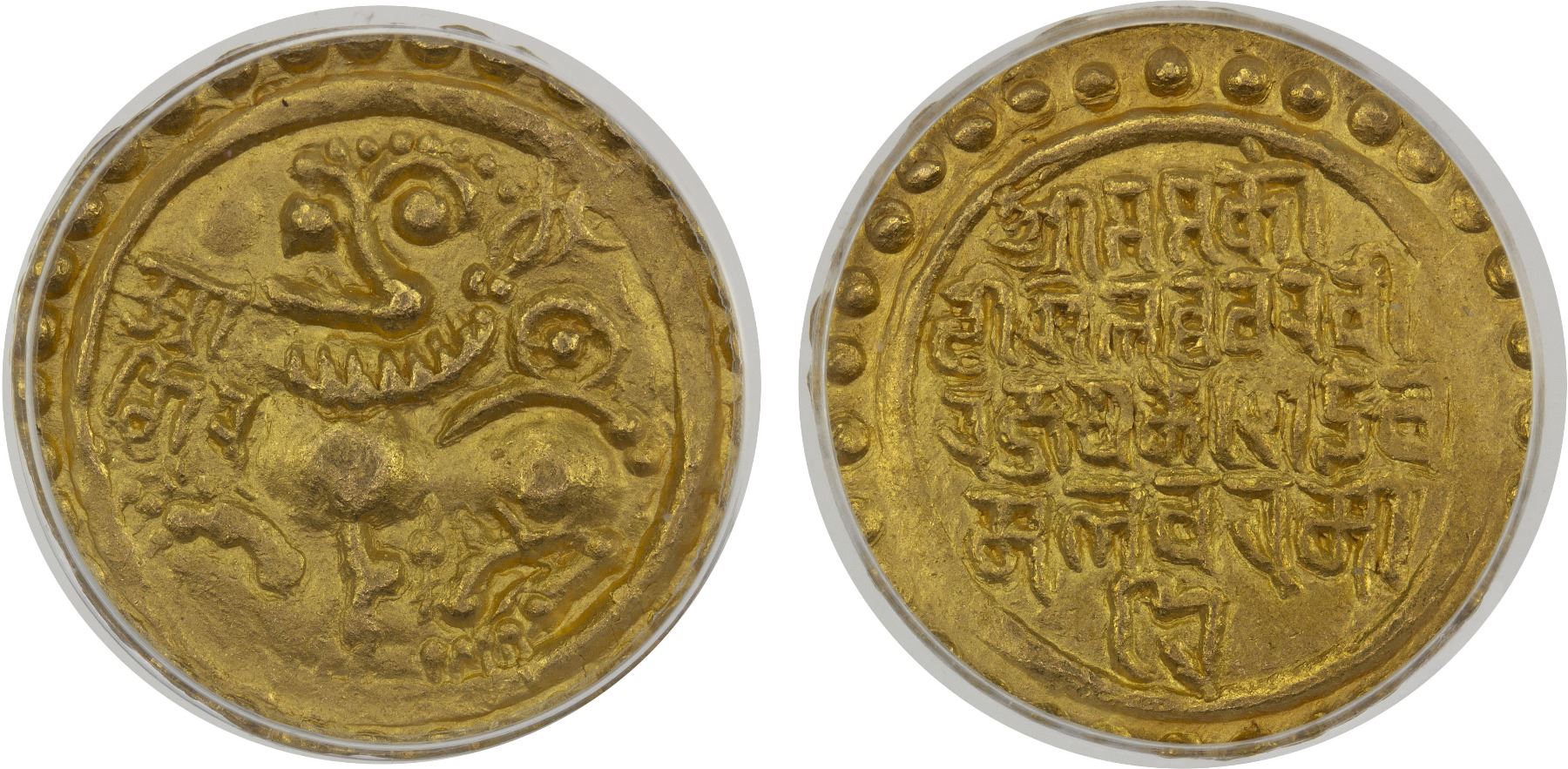 KADAMBAS OF GOA: Jayakesi III, ca. 1187-1216, AV pagoda, Samvatsara Angira (= AD 1212), Mitch-SI-237, cf. Chattopadhyaya-142ff (for type), lion standing left, raising right front leg, sun to right, cyclical date angira in Nagari to left // sri saptako- / tisha labdhavara vi- / ra jayakesi deva / malava rama- / ri, a well-executed strike with clear legends, lustrous, ANACS graded MS62.