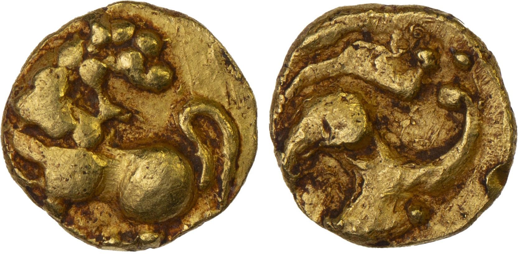KADAMBAS OF HANGAL: Anonymous, AV fanam (0.53g), ca. 11th century, Mitch-KA-228, lion standing left with head reverted // floral scroll, VF.