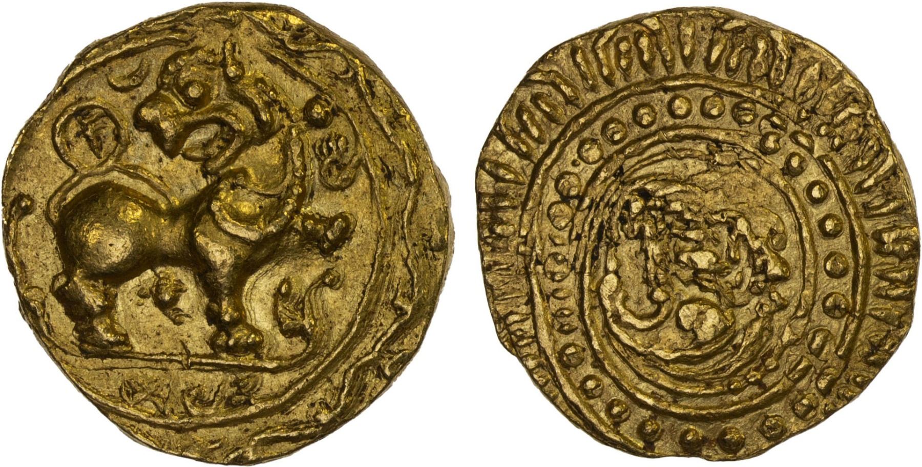 KADAMBAS OF HANGAL: Toyimadeva, fl. 1065, AV pagoda (varaha) (4.19g), Mitch-225/27, Ganesh & Girijapathy-3, lion advancing right with its head turned back, raising left paw, dot within curvature of tail, stylized name toyi in Devanagari in exergue // scroll within decorative border; superb obverse, reverse partly double-struck, AU.