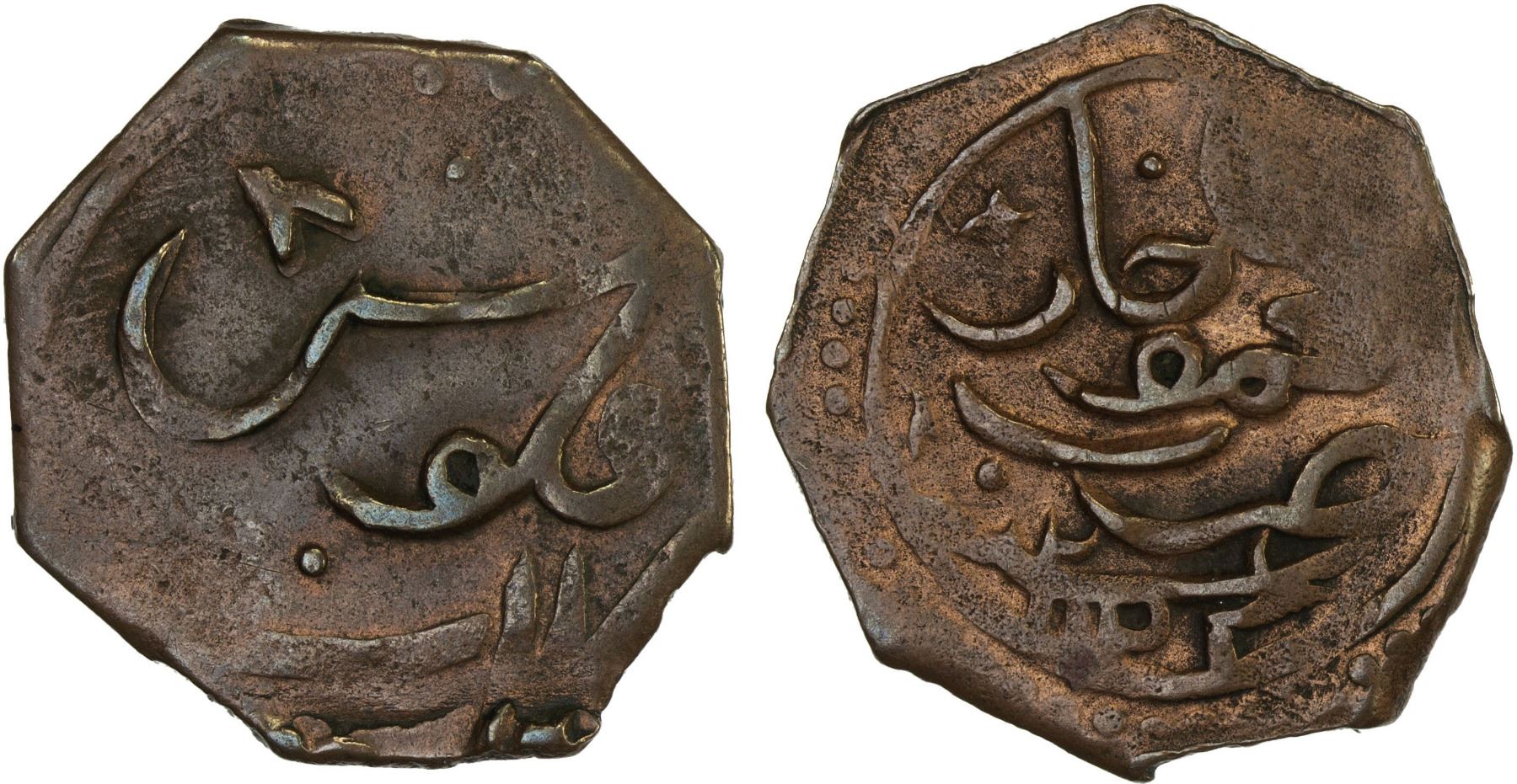 KALAT: Khudadad Khan, 1856-1893, AE falus (4.30g), AH1294, KM-21, struck on an octagonal flan in the name of the long-deceased Durrani ruler Mahmud Khan, accompanied by collector's information card, Choice VF, ex Anton Holt Collection.