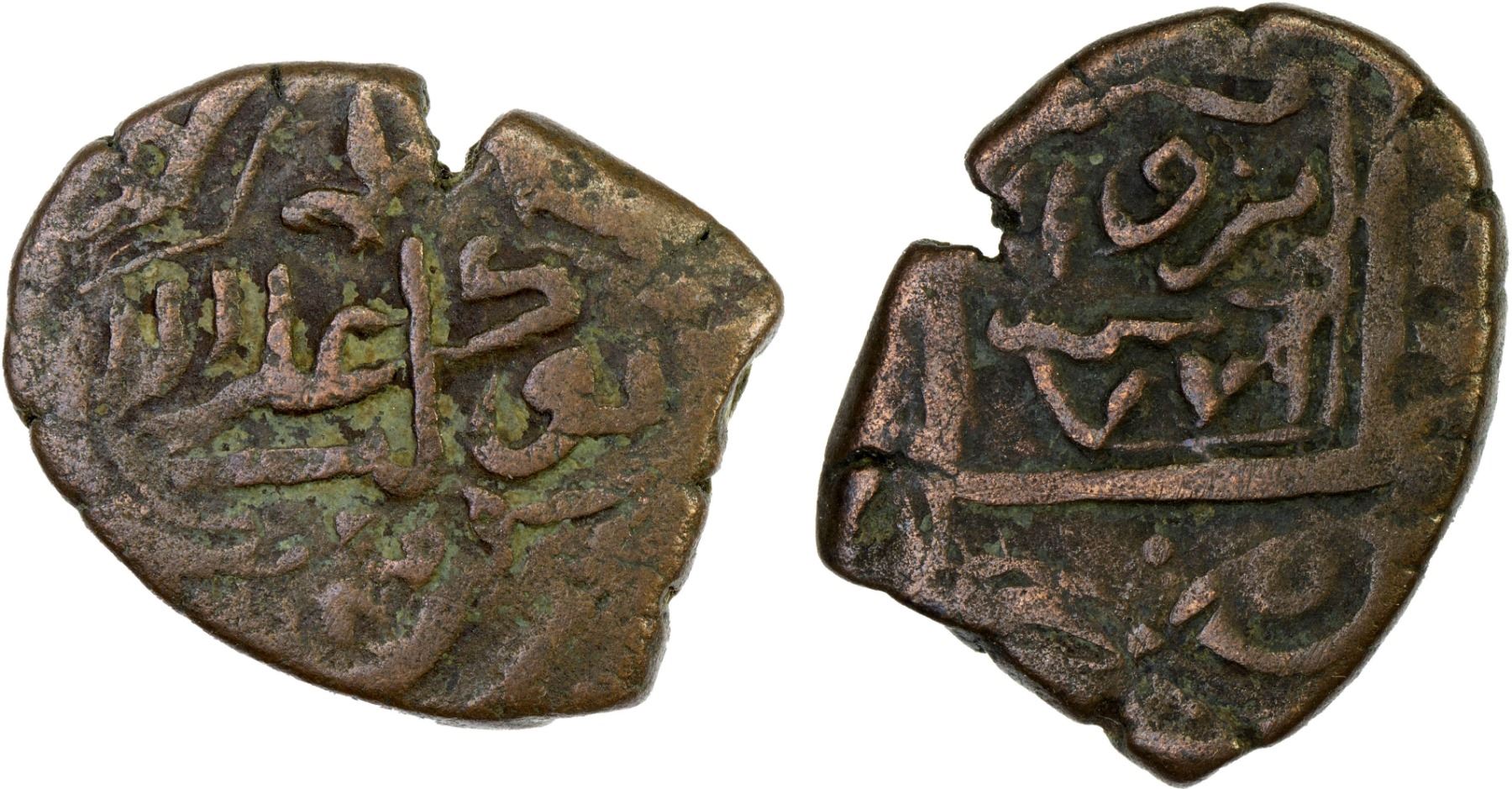 KARTS: temp. Pir 'Ali, 1369-1382, AE fals (4.51g), Sabzawar, AH779, A-2353F, phrase tawakkaltu 'ala Allah // mint & date in square; this type has been published only for a unique example of Herat dated 782 or 783 (Zeno-248658); this is the first known example of Sabzawar, VF, RRR. The only other Kart coin struck as Sabzawar is the silver 12 dirhams dated AH780 (A-2353H, in the Tübingen collection).