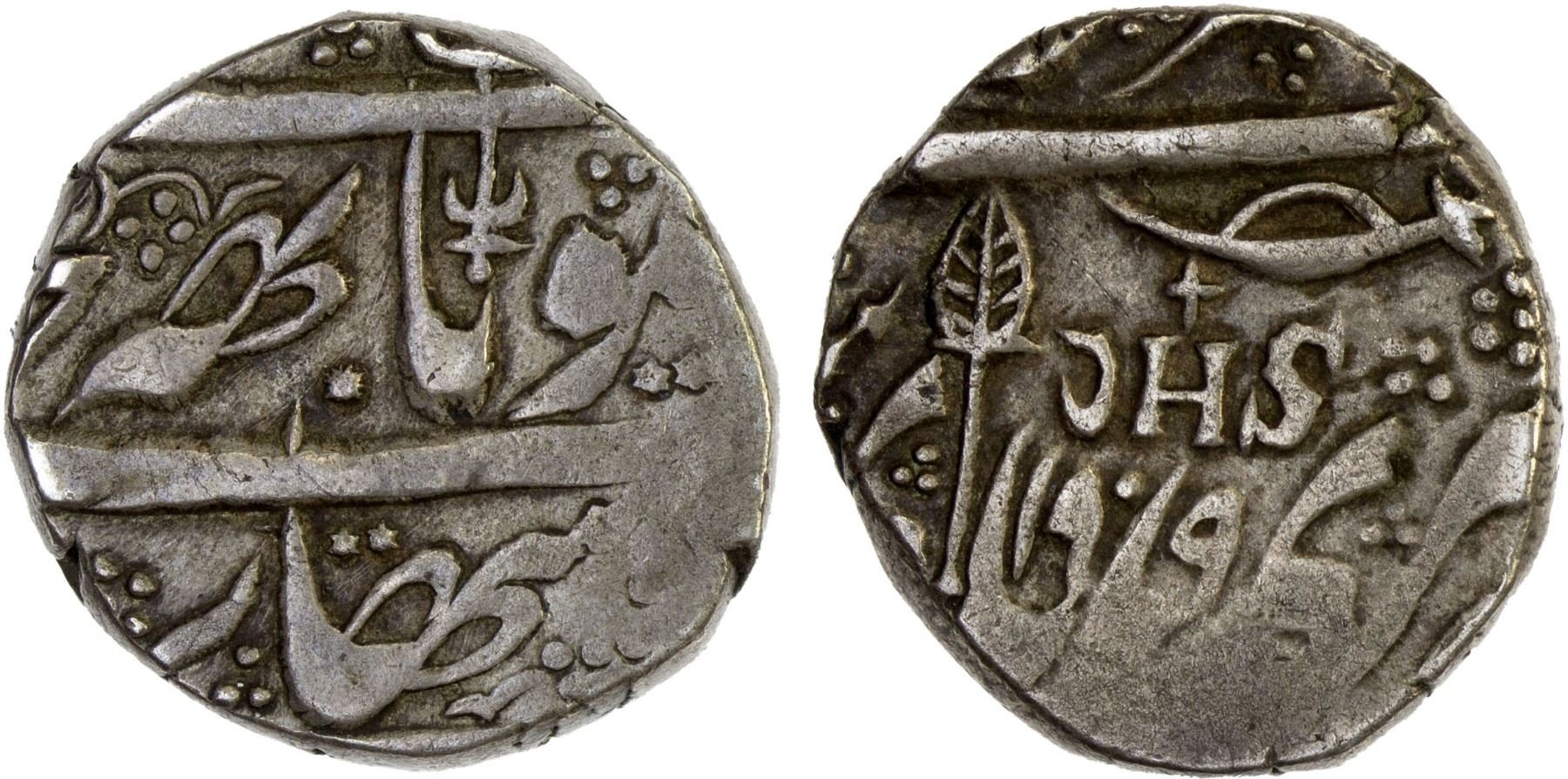 KASHMIR: AR "kham" rupee (10.75g), Srinagar, VS1909 (1852), Y-13, initials JHS below cross on reverse, accompanied by collector's information card, VF, ex Anton Holt Collection. It is speculated that the JNS initials represent the Christogram JHS (or IHS), a Latin acronym for Jesus Honinum Salvator – Jesus Savior of Mankind. Reportedly, a Brahmin by the name of Anand in the Dogra court converted to Christianity and then persuaded the Raja to engrave these letters on his coins as a way to please the British and to bring good fortune to the king.