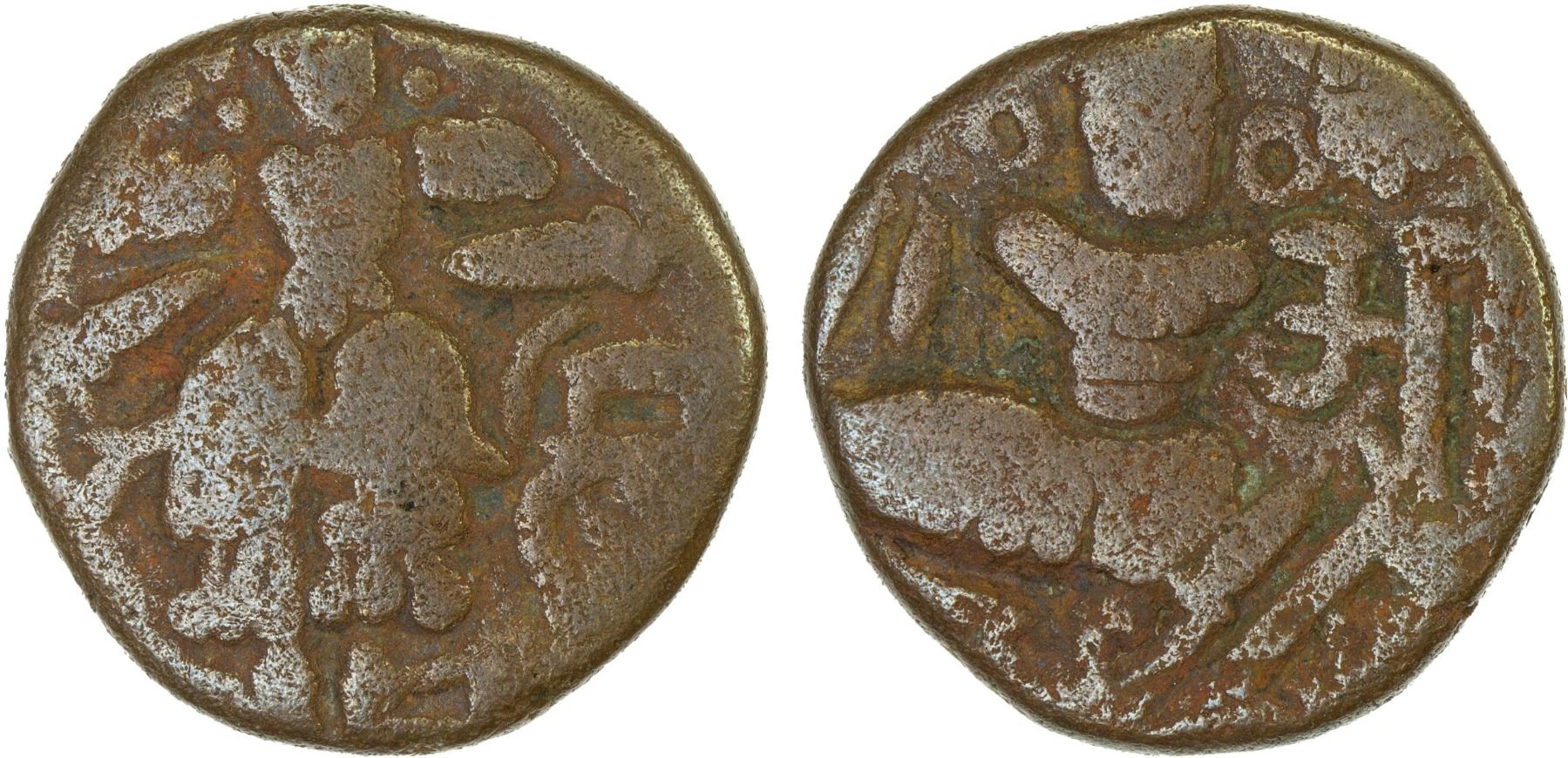 We tentatively assign this example to Anirjitavarman based on a suggested reading ani- on the obverse and rjita on the reverse. Other sources have read the name as Aditya or Abhimasimha.