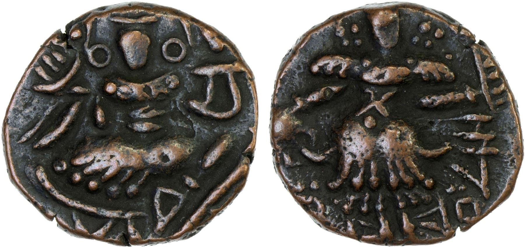 KASHMIR: Chakravarman, 923-937, AE stater (5.69g), Mitch-NI-169, stylized goddess enthroned, legend cha // standing king, kravarma; very rare ruler; with consignor's description, VF-XF, RR, ex Ian Todd Collection.