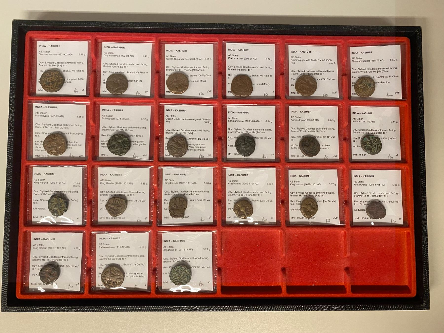 KASHMIR: HINDU RAJAS: LOT of 21 copper staters, including the following rulers, 883-1213 AD: Sankravarman, Gopalavarman, Queen Suganda Rani, Parthavarman, Kshemagupta with Didda Rani, Abhimanyugupta, Nandigupta, Bhimagupta, Queen Didda Rani, Sangramadeva, Anantadeva, Kalasa, Harsha (7 pcs), Salhanadeva, and Jagadeva; average Fine to VF, a few nicer; all with Todd's description; retail value $400, lot of 21 pieces, ex Ian Todd Collection.