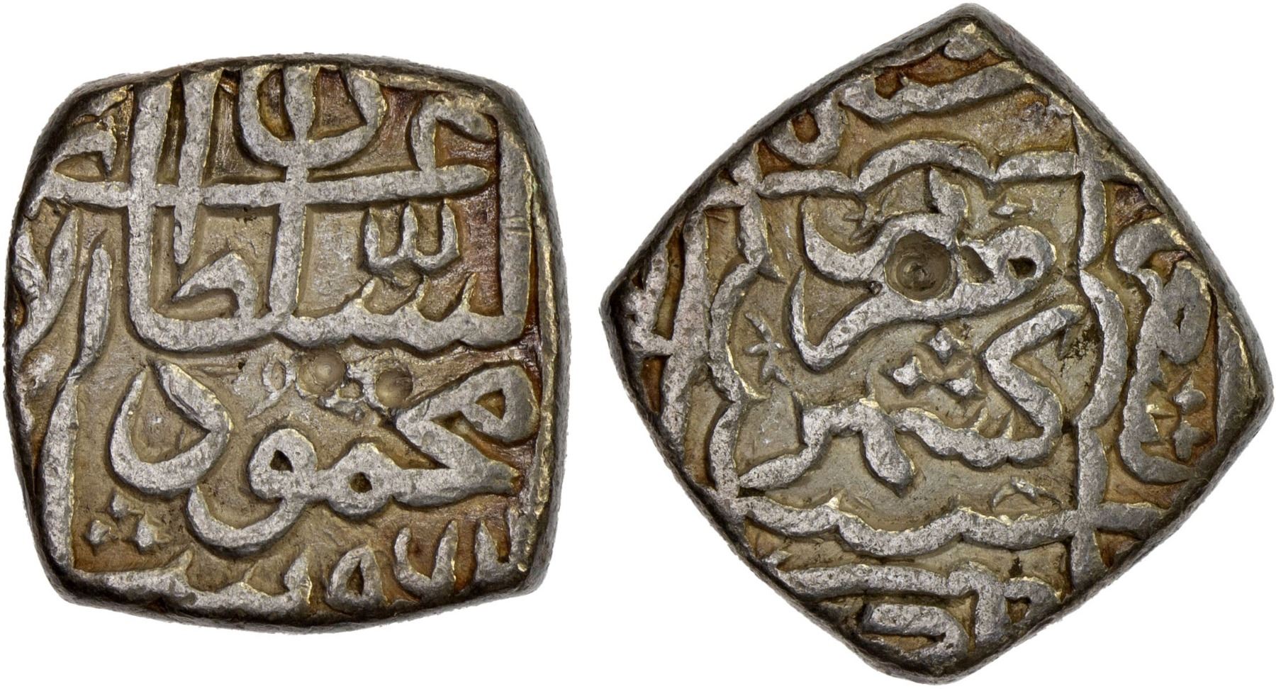 KASHMIR: Habib, 1555, AR square sasnu (6.14g), Kashmir, AH962//959, G-K116, dated 962 on the obverse (9)59 on the reverse; all his coins cite Habib only with his alternative name Mahmud, 3 small testmarks, but a very attractive example, VF, R.