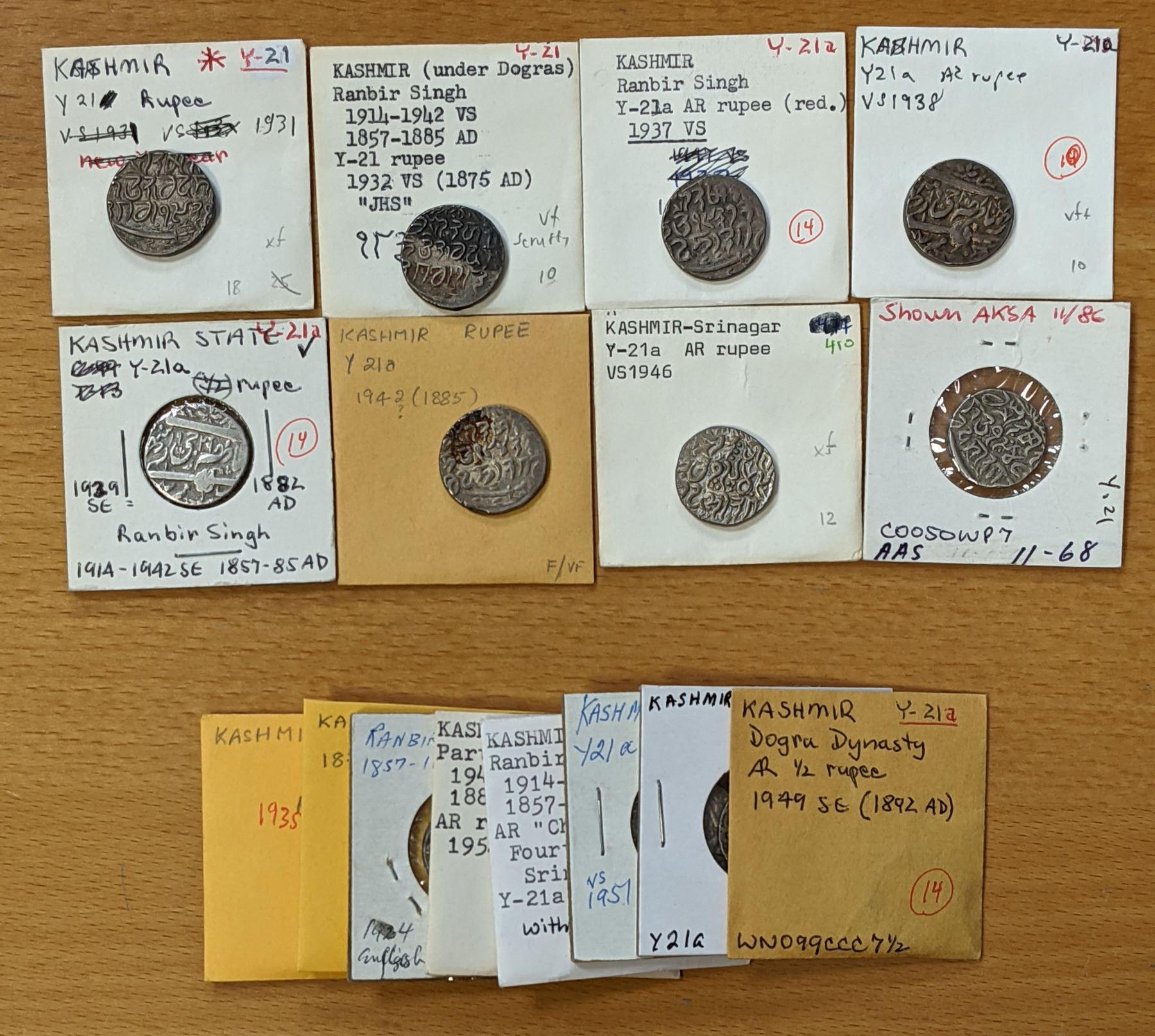 KASHMIR:LOT of 16 silver rupees of the Kashmir state: type Y-21, VS1931 and 1932; and Y-21a: VS1934 (2 pcs), 1935, 1936, 1937, 1938, 1942,1956, 1948, 1949, 1950, 1951, and 1952, identified by the consignor; all VF condition, many better; retail value $400, lot of 16 pieces.