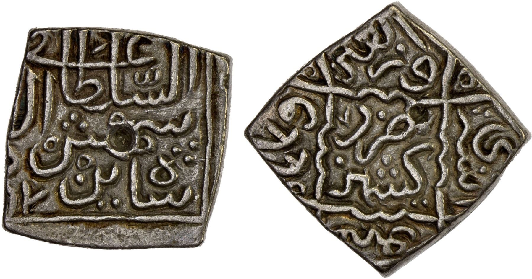 KASHMIR: Shams al-Din II, ca. 1537-1538, AR square sasnu (6.17g), Kashmir, AH842 (frozen), G-K92, well-centered strike, with only 2 very small testmarks, VF-XF, RR.