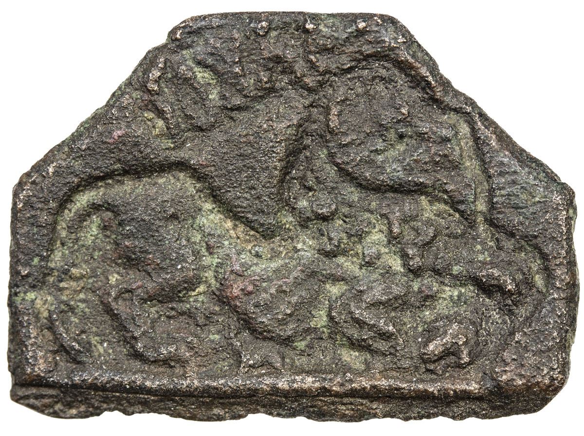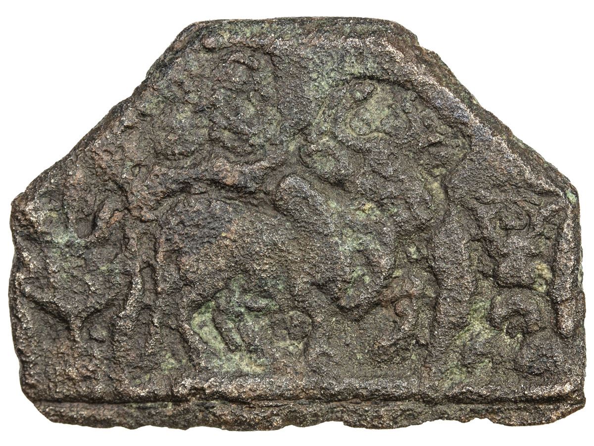 KAUSAMBI: Radhamitra, 1st century BC, cast AE hexagonal unit (3.82g), Pieper-981 (this piece), lion couchant to right, Brahmi legend punch above reading radhamitasa // bull facing nandipada-on-hill, railed tree left, Ujjain symbol above, extremely rare and remarkably well preserved, especially for a cast coin, choice VF, RRR. Fascinating cast coin of pseudo-punchmarked technique, an amazing coin almost never available on the market.