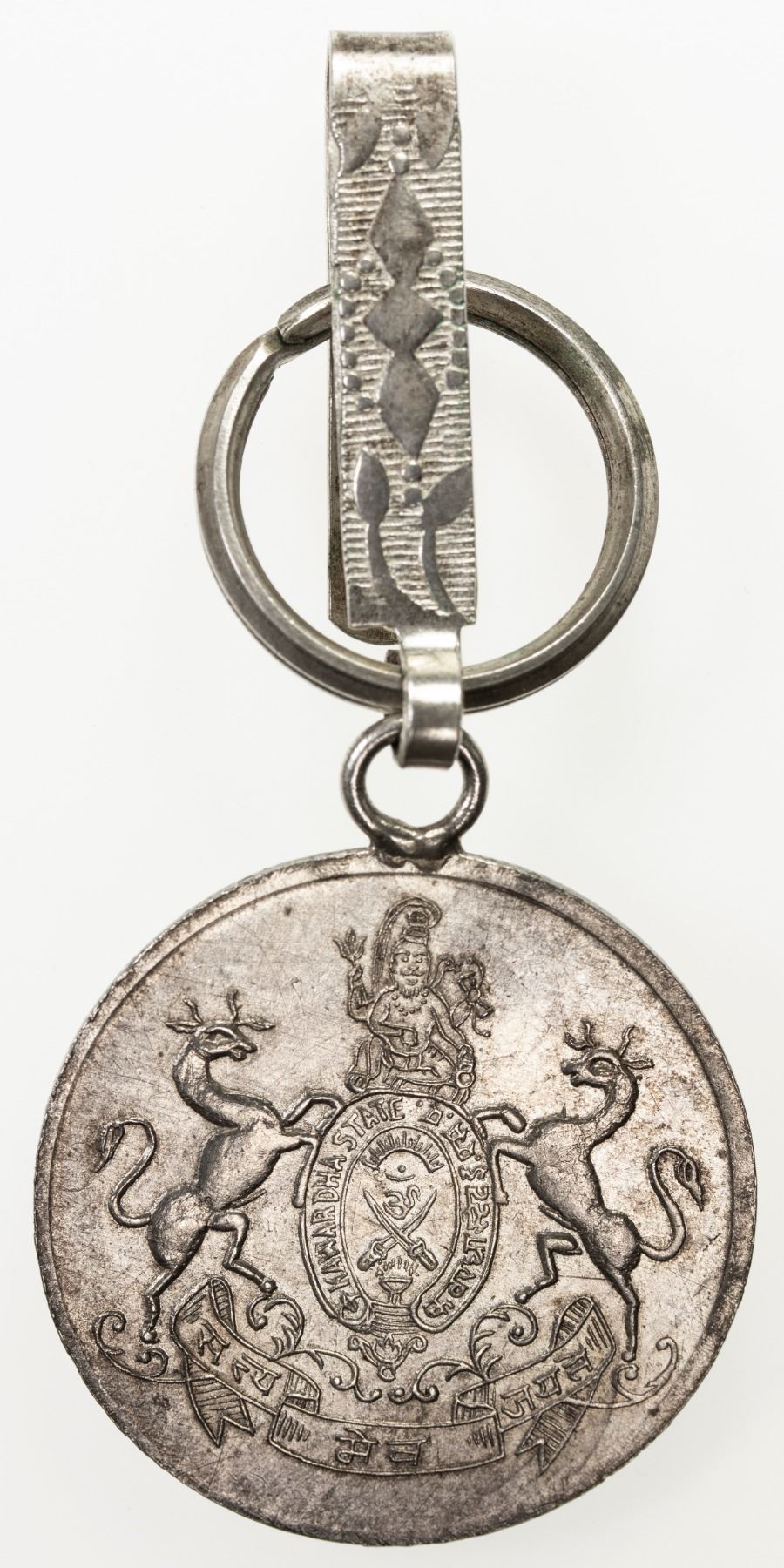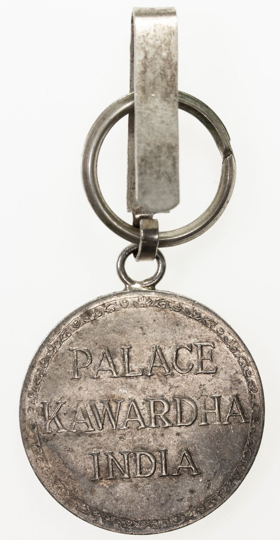 KAWARDHA: AR medal, ND, 37mm, Coat of Arms of the Princely State of Kawardha // PALACE / KAWARDHA / INDIA, with silver suspender and clip, EF. Kawardha State was one of the princely states in the Central Provinces of India during the period of the British Raj. The Palace in Kawardha, Chhattisgarh is situated in the Maikal Ranges at an altitude of 941 meters above sea level. The palace spreads over eleven acres of land and is built with Italian marble and stone. The main gateway to the Kawardha Palace is known as the Haathi Darwaza (Elephant Gate). The structure marks the royal processions of the past that were headed by elephants. The splendid domed and filigreed durbar hall of Kawardha Palace is set with marble staircases and the graceful courtyards. The State Palace was converted into a hotel after Independence.