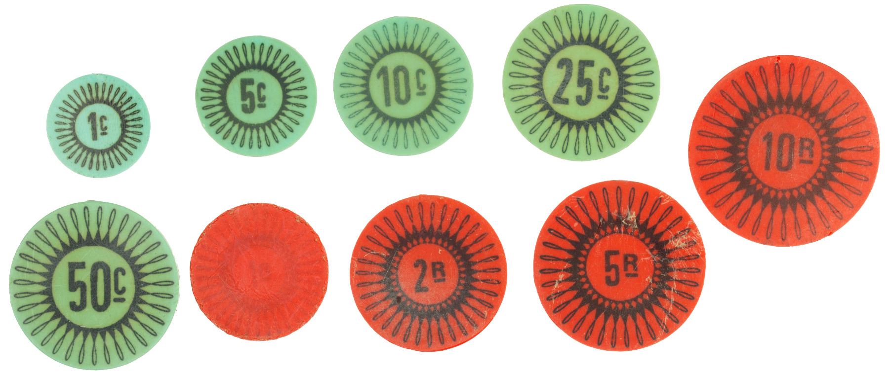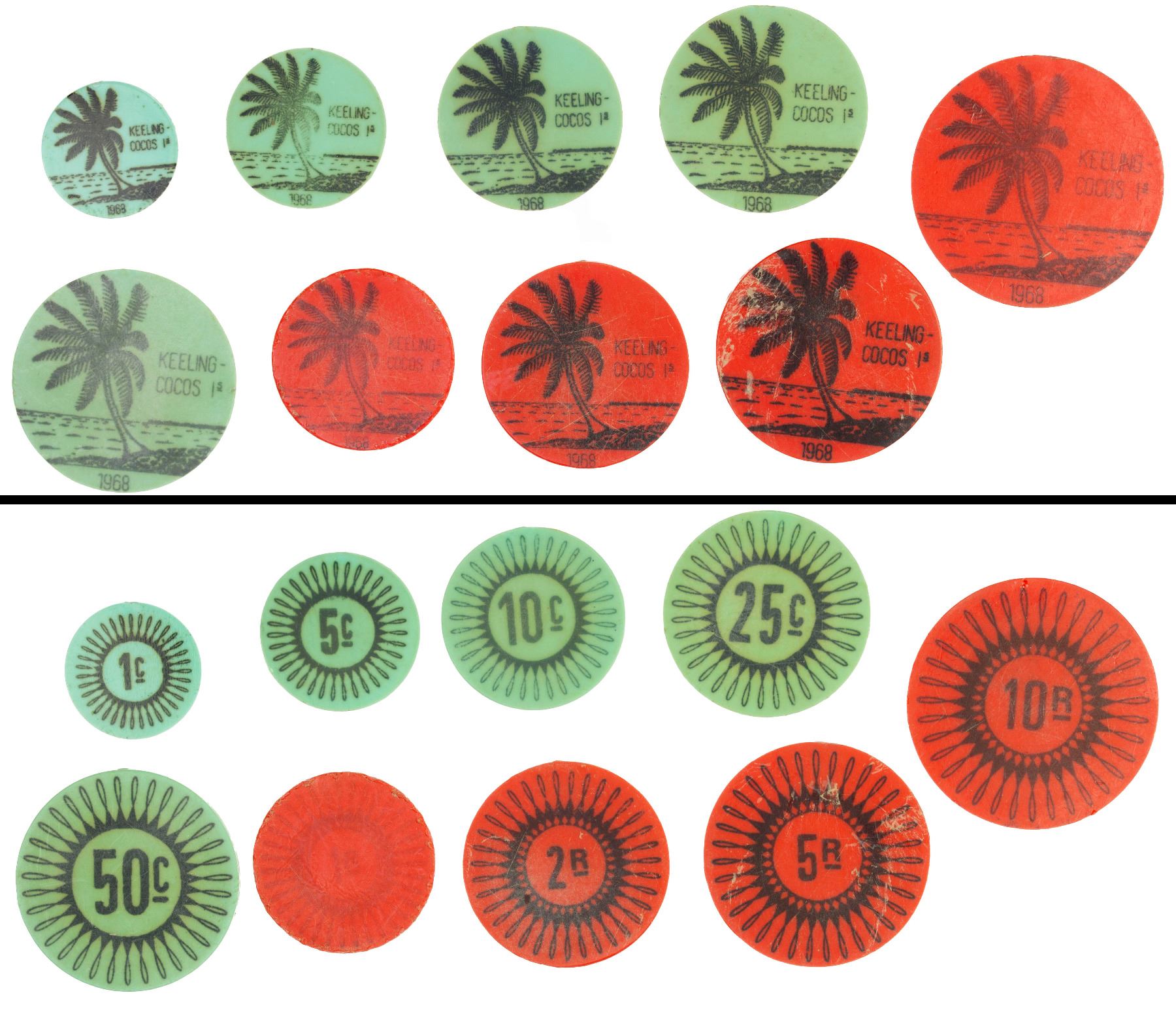 KEELING-COCOS ISLANDS: Australian Territory, 9-coin set, 1968, a nearly complete set of these elusive 1968-series plastic tokens, KM-Tn8 through Tn16, only missing the 25 rupees, "KEELING COCOS Is" next to a palm tree with sea in the background // value within a decorative border; 1, 2, 5 and 10 rupees are red plastic, 1, 5, 10, 25 and 50 cents are green plastic, some slight fading on a few of the pieces, but overall in great condition, a very rare set! set of 9 pieces.