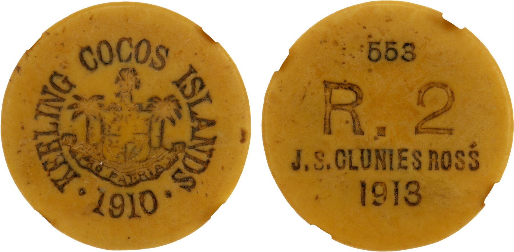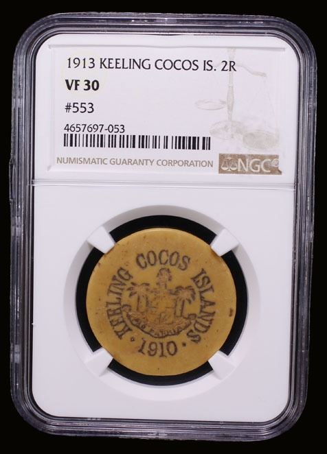 KEELING-COCOS ISLANDS: John S. Clunies-Ross, 1910-1944, 2 rupees token, 1913, KM-Tn6, round plastic "ivory" token, KEELING COCOS ISLANDS around emblem, "1910" below // "276 / R.2 / J.S CLUNIES ROSS / 1913", NGC graded VF30.
